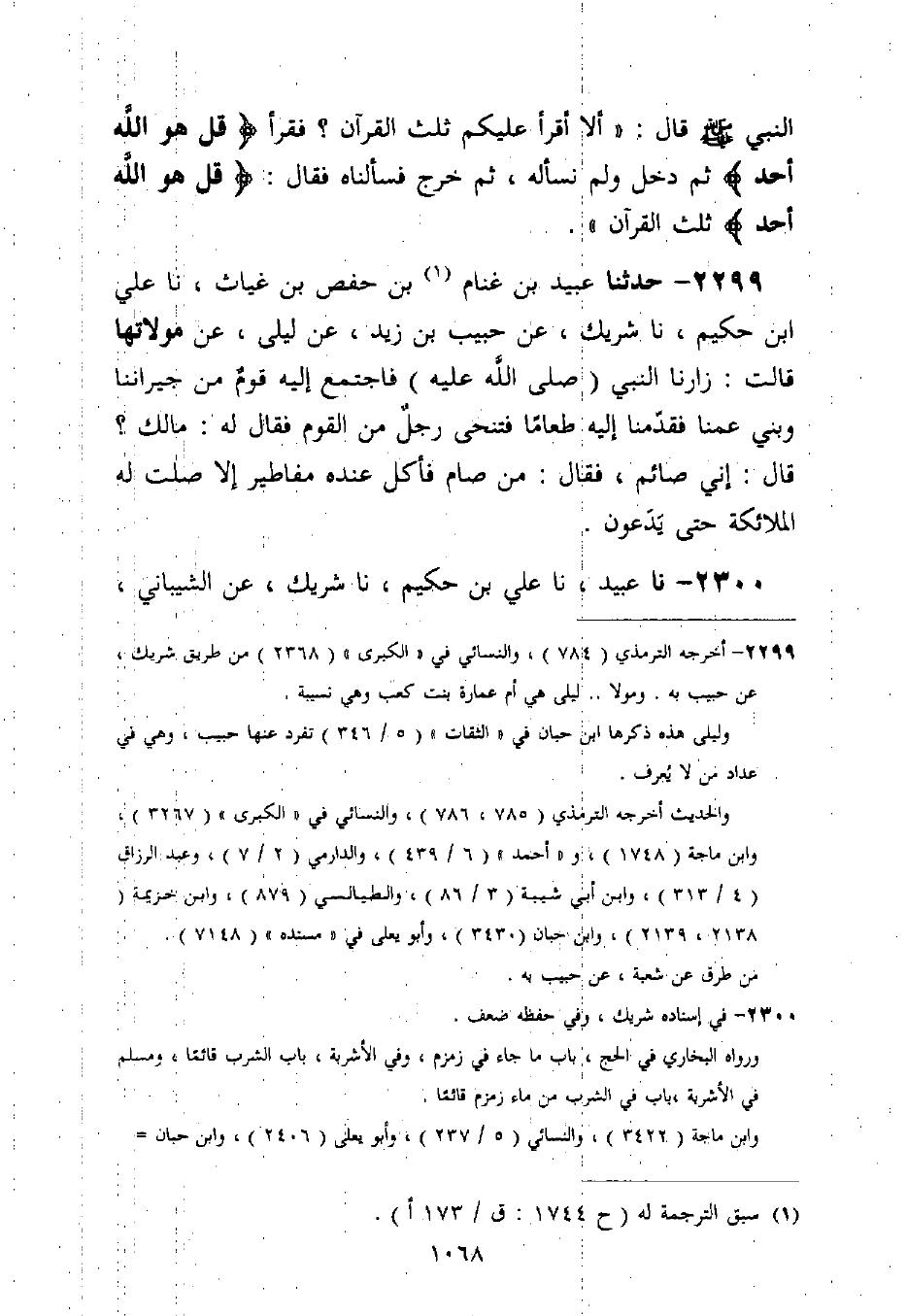 2299 - حَدَّثَنَا عُبَيْدُ بْنُ غَنَّامِ بْنِ حَفْصِ بْنِ غِيَاثٍ، نا عَلِيُّ بْنُ حَكِيمٍ، نا شَرِيكٌ، عَنْ حَبِيبِ بْنِ زَيْدٍ، عَنْ لَيْلَى، عَنْ مَوْلَاتِهَا قَالَتْ: زَارَنَا النَّبِيُّ صَلَّى اللَّهُ عَلَيْهِ وَسَلَّمَ، فَاجْتَمَعَ إِلَيْهِ قَوْمٌ مِنْ جِيرَانِنَا وَبَنِي عَمِّنَا، فَقَدَّمْنَا إِلَيْهِ طَعَامًا، فَتَنَحَّى رَجُلٌ مِنَ الْقَوْمِ، فَقَالَ لَهُ: مَالَكَ؟ قَالَ: إِنِّي صَائِمٌ، فَقَالَ: §مَنْ صَامَ فَأَكَلَ عِنْدَهُ مَفَاطِيرُ إِلَّا صَلَّتْ لَهُ الْمَلَائِكَةُ حَتَّى يَدَعُونَ
