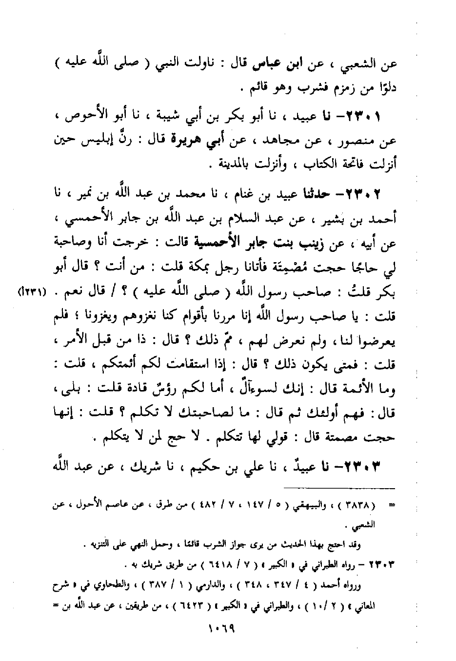 2302 - حَدَّثَنَا عُبَيْدُ بْنُ غَنَّامٍ، نا مُحَمَّدُ بْنُ عَبْدِ اللَّهِ بْنِ نُمَيْرٍ، نا أَحْمَدُ بْنُ بَشِيرٍ، عَنْ عَبْدِ السَّلَامِ بْنِ عَبْدِ اللَّهِ بْنِ جَابِرٍ الْأَحْمَسِيِّ، عَنْ أَبِيهِ، عَنْ زَيْنَبَ بِنْتِ جَابِرٍ الْأَحْمَسِيَّةِ قَالَتْ: §خَرَجْتُ أَنَا وَصَاحِبَةٌ لِي حَاجَّةٌ , حَجَّتْ مُصْمِتَةً، فَأَتَانَا رَجُلٌ بِمَكَّةَ، قُلْتُ: مَنْ أَنْتَ؟ قَالَ: أَبُو بَكْرٍ , قُلْتُ: صَاحِبُ رَسُولِ اللَّهِ صَلَّى اللَّهُ عَلَيْهِ وَسَلَّمَ؟ قَالَ: نَعَمْ، قُلْتُ: يَا صَاحِبَ رَسُولِ اللَّهِ إِنَّا مَرَرْنَا بِأَقْوَامٍ كُنَّا نَغْزُوهُمْ وَيَغْزُونَا، فَلَمْ يَعْرِضُوا لَنَا، وَلَمْ نَعْرِضْ لَهُمْ، مِمَّ ذَلِكَ؟ قَالَ: ذَا مِنْ قَبْلِ الْأَمْرِ، قُلْتُ: فَمَتَى يَكُونُ ذَلِكَ؟ قَالَ: إِذَا اسْتَقَامَتْ لَكُمْ أَئِمَّتُكُمْ، قُلْتُ: وَمَا الْأَئِمَّةُ؟ قَالَ: إِنَّكِ لَسَئُولٌ، أَمَا لَكُمْ رُؤُسٌ قَادَةٌ، قُلْتُ: بَلَى قَالَ: فَهُمْ أُولَئِكَ، ثُمَّ قَالَ: مَا لِصَاحِبَتِكِ لَا تَكَلَّمُ؟ قُلْتُ: إِنَّهَا حَجَّتْ مُصْمِتَةً قَالَ: قُولِي لَهَا تَتَكَلَّمْ، لَا حَجَّ لِمَنْ لَا يَتَكَلَّمُ