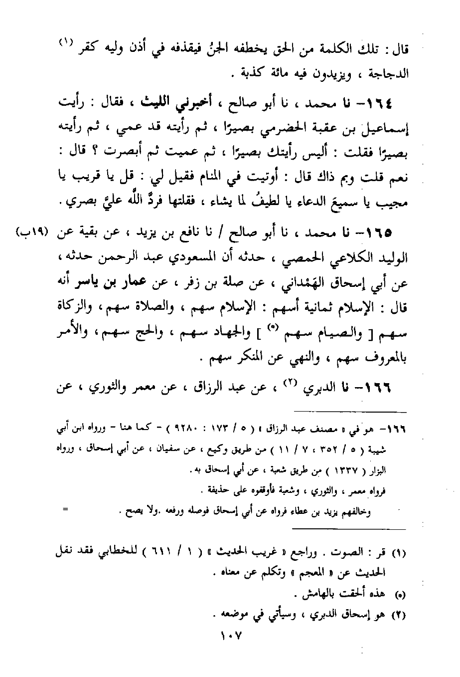 165 - نا مُحَمَّدٌ، نا أَبُو صَالِحٍ، نا نَافِعُ بْنُ يَزِيدَ، عَنْ بَقِيَّةَ، [بْنِ] (1) الْوَلِيدِ الْكَلَاعِيِّ الْحِمْصِيِّ، حَدَّثَهُ أَنَّ الْمَسْعُودِيَّ عَبْدَ الرَّحْمَنِ حَدَّثَهُ، عَنْ أَبِي إِسْحَاقَ الْهَمْدَانِيِّ، عَنْ صِلَةَ بْنِ زُفَرَ، عَنْ عَمَّارِ بْنِ يَاسِرٍ، أَنَّهُ قَالَ: " §الْإِسْلَامُ ثَمَانِيَةُ أَسْهُمٍ: الْإِسْلَامُ سَهْمٌ، وَالصَّلَاةُ سَهْمٌ، وَالزَّكَاةُ سَهْمٌ، وَالصِّيَامُ سَهْمٌ، وَالْجِهَادُ سَهْمٌ، وَالْحَجُّ سَهْمٌ، وَالْأَمْرُ بِالْمَعْرُوفِ سَهْمٌ، وَالنَّهْيُ عَنِ الْمُنْكَرِ سَهْمٌ "