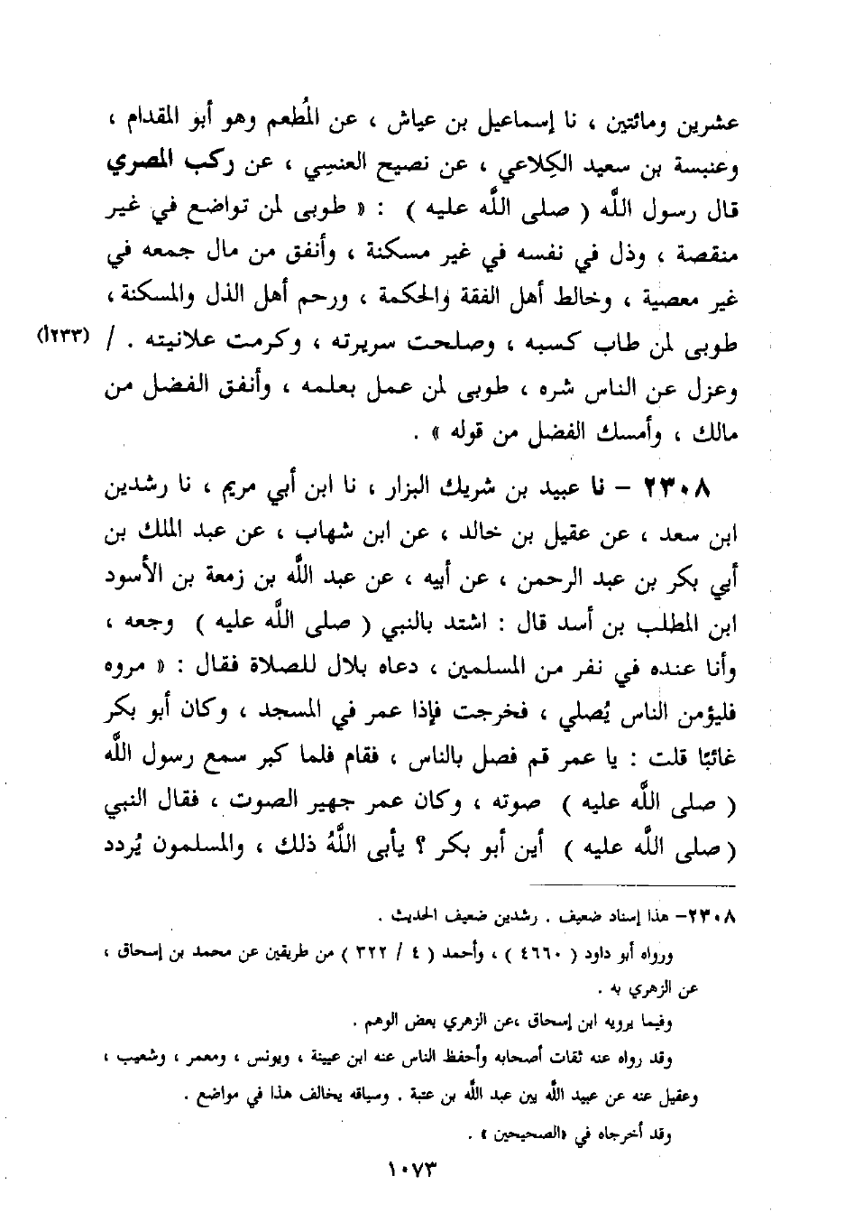 2308 - نا عُبَيْدُ بْنُ شَرِيكٍ الْبَزَّارُ، نا ابْنُ أَبِي مَرْيَمَ، نا رِشْدِينُ بْنُ سَعْدٍ، عَنْ عَقِيلِ بْنِ خَالِدٍ، عَنِ ابْنِ شِهَابٍ، عَنْ عَبْدِ الْمَلِكِ بْنِ أَبِي بَكْرِ بْنِ عَبْدِ الرَّحْمَنِ، عَنْ أَبِيهِ، عَنْ عَبْدِ اللَّهِ بْنِ زَمْعَةَ بْنِ الْأَسْوَدِ بْنِ الْمُطَّلِبِ بْنِ أَسَدٍ قَالَ: اشْتَدَّ بِالنَّبِيِّ صَلَّى اللَّهُ عَلَيْهِ وَسَلَّمَ وَجَعُهُ، وَأَنَا عِنْدَهُ فِي نَفَرٍ مِنَ الْمُسْلِمِينَ، دَعَاهُ بِلَالٌ لِلصَّلَاةِ، فَقَالَ: §مُرُوهُ فَلْيَؤُمَّنَّ النَّاسَ يُصَلِّي، فَخَرَجْتُ، فَإِذَا عُمَرُ فِي الْمَسْجِدِ، وَكَانَ أَبُو بَكْرٍ غَائِبًا، قُلْتُ: يَا عُمَرُ، قُمْ فَصَلِّ بِالنَّاسِ، فَقَامَ، فَلَمَّا كَبَّرَ سَمِعَ رَسُولُ اللَّهِ صَلَّى اللَّهُ عَلَيْهِ وَسَلَّمَ صَوْتَهُ، وَكَانَ عُمَرُ جَهِيرَ الصَّوْتِ، فَقَالَ النَّبِيُّ صَلَّى اللَّهُ عَلَيْهِ وَسَلَّمَ: أَيْنَ أَبُو بَكْرٍ؟ يَأْبَى اللَّهُ ذَلِكَ وَالْمُسْلِمُونَ , يُرَدِّدُ -[1074]- ذَلِكَ مِرَارًا قَالَ: فَبَعَثَ إِلَى أَبِي بَكْرٍ، فَجَاءَ بَعْدَ أَنْ صَلَّى عُمَرُ تِلْكَ الصَّلَاةَ، فَصَلَّى أَبُو بَكْرٍ بِالنَّاسِ قَالَ عُمَرُ لِعَبْدِ اللَّهِ بْنِ زَمْعَةَ: وَاللَّهِ مَا ظَنَنْتُ حَيْثُ أَمَرْتَنِي أَنْ أُصَلِّيَ بِالنَّاسِ، إِلَّا أَنَّ رَسُولَ اللَّهِ صَلَّى اللَّهُ عَلَيْهِ وَسَلَّمَ أَمَرَكَ بِذَلِكَ، وَلَوْلَا ذَلِكَ مَا صَلَّيْتُ بِالنَّاسِ قَالَ: مَا أَمَرَنِي رَسُولُ اللَّهِ صَلَّى اللَّهُ عَلَيْهِ وَسَلَّمَ، وَلَكِنْ حِينَ لَمْ أَرَ أَبَا بَكْرٍ رَأَيْتُكَ أَحَقَّ مَنْ حَضَرَ