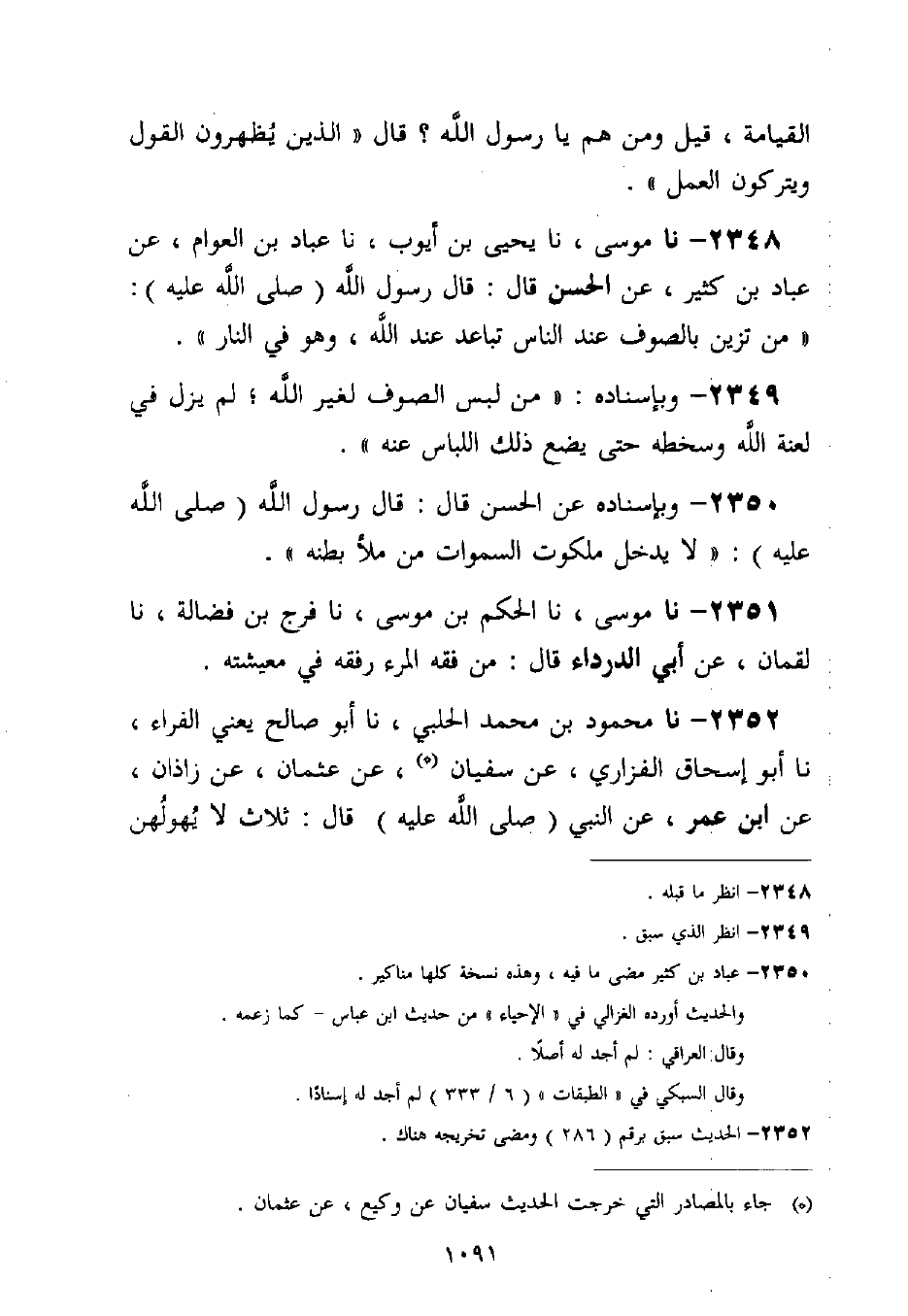 2349 - وَبِإِسْنَادِهِ: §مَنْ لَبِسَ الصُّوفَ لِغَيْرِ اللَّهِ، لَمْ يَزَلْ فِي لَعْنَةِ اللَّهِ وَسَخَطِهِ حَتَّى يَضَعَ ذَلِكَ اللِّبَاسَ عَنْهُ