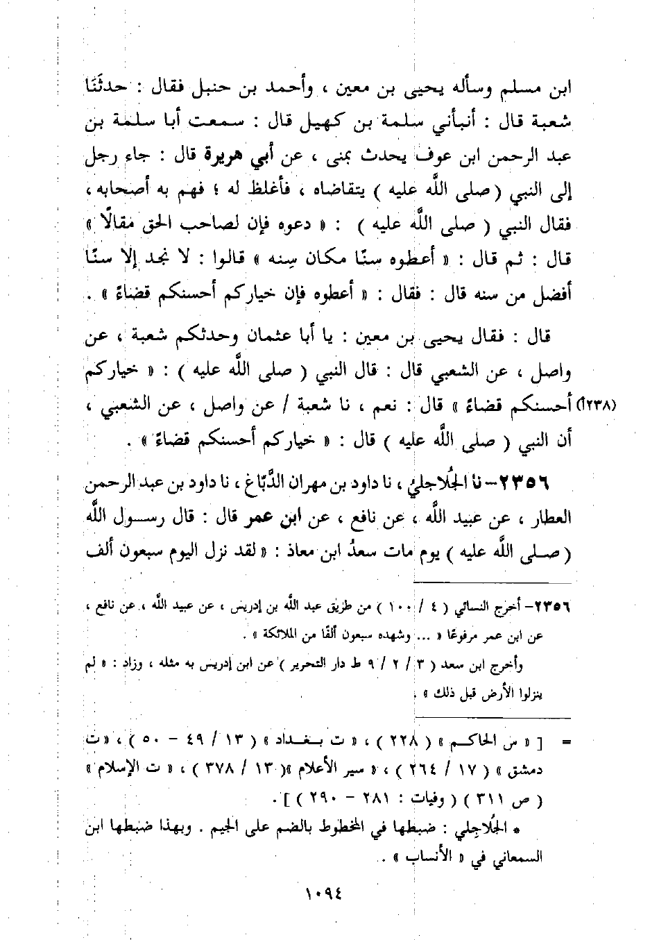 2356 - نا الْجَلَاجِلِيُّ، نا دَاوُدُ بْنُ مِهْرَانَ الدَّبَّاغُ، نا دَاوُدُ بْنُ عَبْدِ الرَّحْمَنِ الْعَطَّارُ، عَنْ عُبَيْدِ اللَّهِ، عَنْ نَافِعٍ، عَنِ ابْنِ عُمَرَ قَالَ: قَالَ رَسُولُ اللَّهِ صَلَّى اللَّهُ عَلَيْهِ وَسَلَّمَ يَوْمَ مَاتَ سَعْدُ بْنُ مُعَاذٍ: §لَقَدْ نَزَلَ الْيَوْمَ سَبْعُونَ أَلْفَ -[1095]- مَلَكٍ، مَا نَزَلُوا قَبْلَ يَوْمِهِمْ هَذَا، يَشْهَدُونَ جِنَازَةَ سَعْدٍ