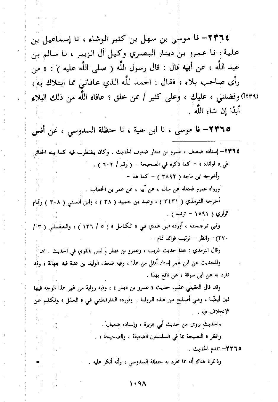 2364 - نا مُوسَى بْنُ سَهْلِ بْنِ كَثِيرٍ الْوَشَّاءُ، نا إِسْمَاعِيلُ ابْنُ عُلَيَّةَ، نا عَمْرُو بْنُ دِينَارٍ الْبَصْرِيُّ، وَكِيلُ آلِ الزُّبَيْرِ، نا سَالِمُ بْنُ عَبْدِ اللَّهِ، عَنْ أَبِيهِ قَالَ: قَالَ رَسُولُ اللَّهِ صَلَّى اللَّهُ عَلَيْهِ وَسَلَّمَ: §مَنْ رَأَى صَاحِبَ بَلَاءٍ، فَقَالَ: الْحَمْدُ لِلَّهِ الَّذِي عَافَانِي مِمَّا ابْتَلَاكَ بِهِ، وَفَضَّلَنِي عَلَيْكَ، وَعَلَى كَثِيرٍ مِمَّنْ خَلَقَ، عَافَاهُ اللَّهُ مِنْ ذَلِكَ الْبَلَاءِ أَبَدًا إِنْ شَاءَ اللَّهُ