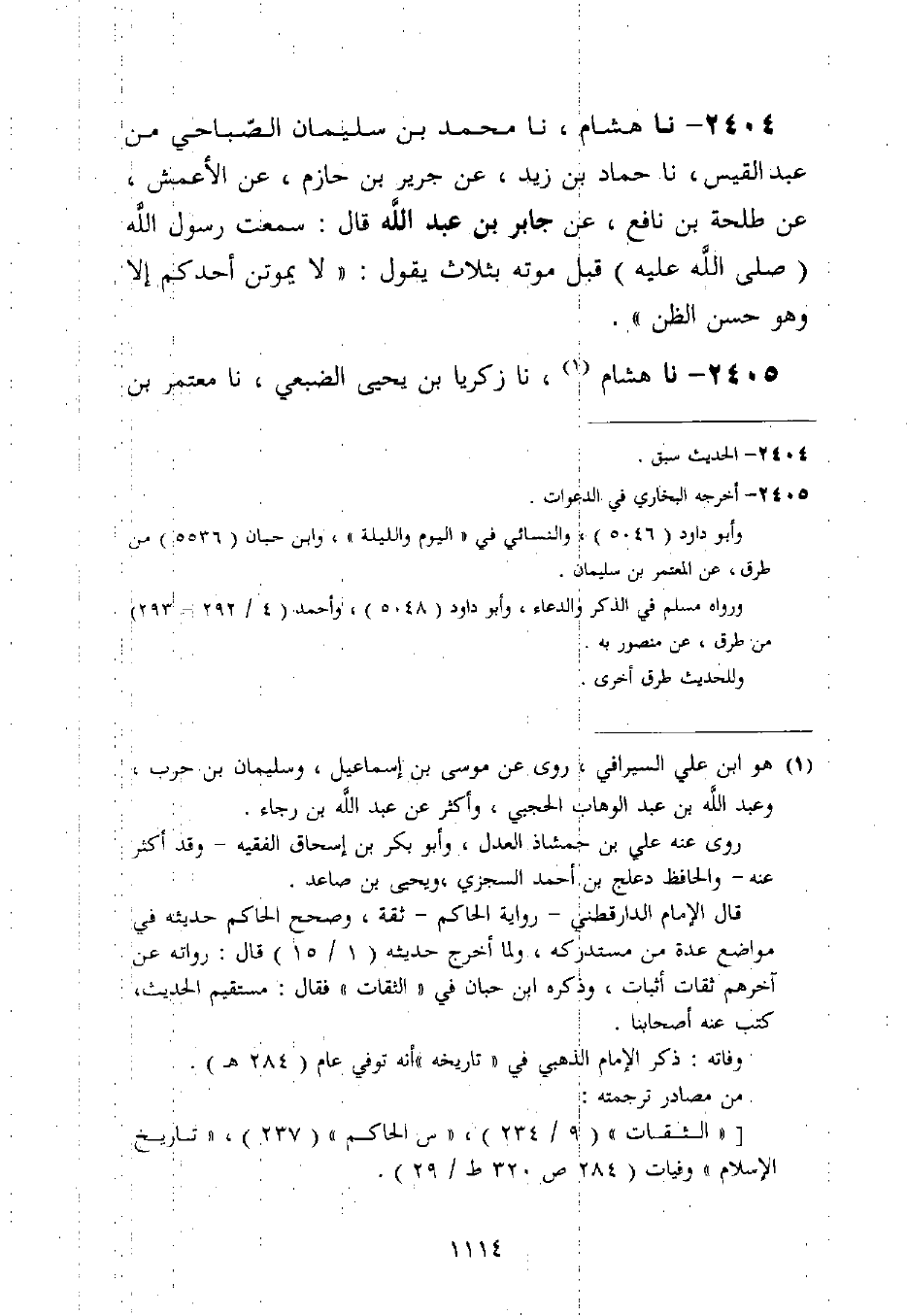 2404 - نا هِشَامٌ، نا مُحَمَّدُ بْنُ سُلَيْمَانَ الصُّبَاحِيُّ، مِنْ عَبْدِ الْقَيْسِ، نا حَمَّادُ بْنُ زَيْدٍ، عَنْ جَرِيرِ بْنِ حَازِمٍ، عَنِ الْأَعْمَشِ، عَنْ طَلْحَةَ بْنِ نَافِعٍ، عَنْ جَابِرِ بْنِ عَبْدِ اللَّهِ قَالَ: سَمِعْتُ رَسُولَ اللَّهِ صَلَّى اللَّهُ عَلَيْهِ قَبْلَ مَوْتِهِ بِثَلَاثٍ يَقُولُ: «§لَا يَمُوتَنَّ أَحَدُكُمْ إِلَّا وَهُوَ حَسَنُ الظَّنُّ»