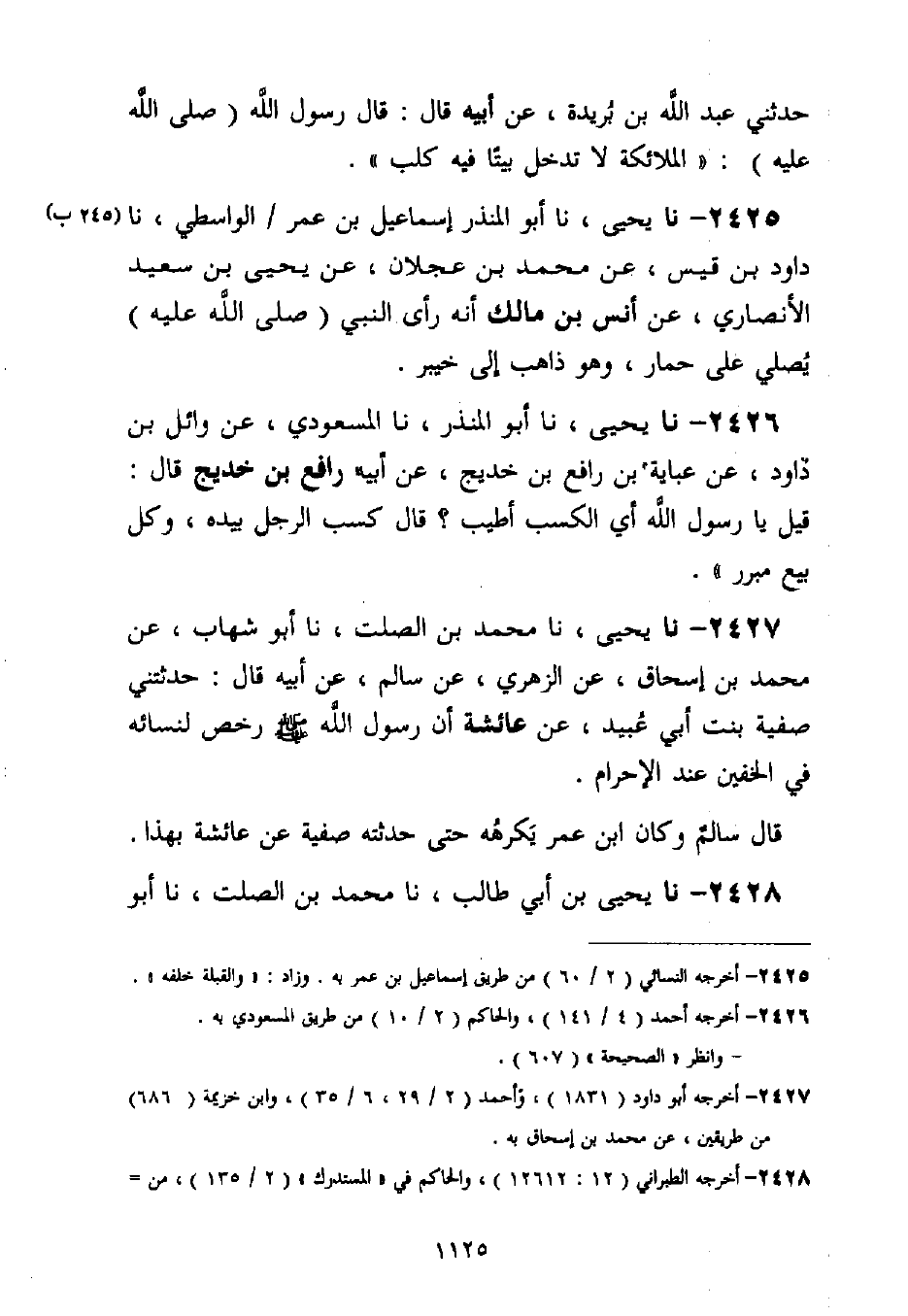 2427 - نا يَحْيَى، نا مُحَمَّدُ بْنُ الصَّلْتِ، نا أَبُو شِهَابٍ، عَنْ مُحَمَّدِ بْنِ إِسْحَاقَ، عَنِ الزُّهْرِيِّ، عَنْ سَالِمٍ، عَنْ أَبِيهِ قَالَ: حَدَّثَتْنِي صَفِيَّةُ بِنْتُ أَبِي عُبَيْدٍ، عَنْ عَائِشَةَ، أَنَّ رَسُولَ اللَّهِ صَلَّى اللَّهُ عَلَيْهِ وَسَلَّمَ §رَخَّصَ لِنِسَائِهِ فِي الْخُفَّيْنِ عِنْدَ الْإِحْرَامِ.