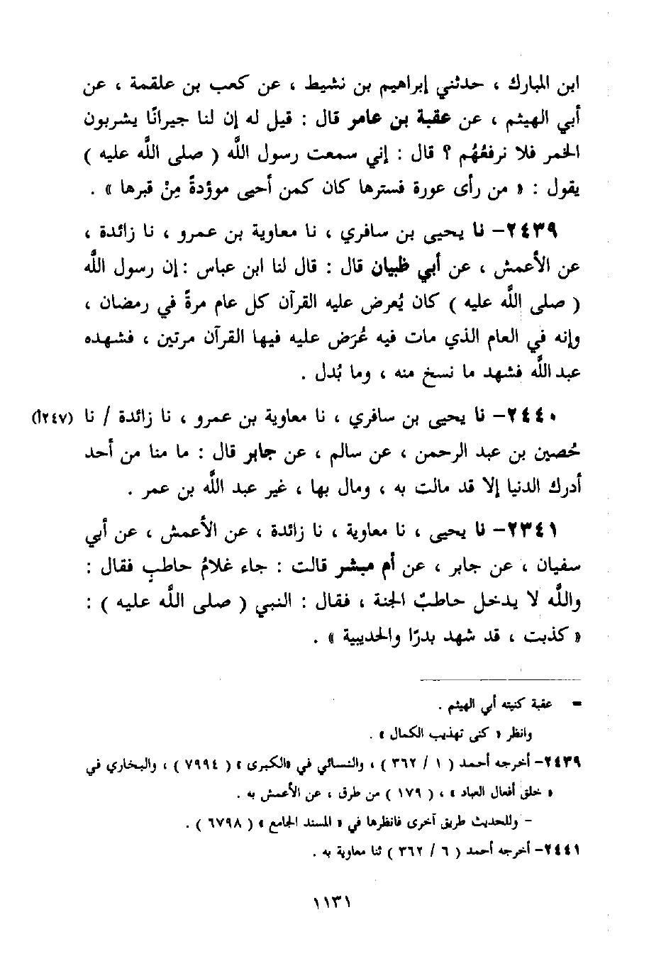 2441 - نا يَحْيَى، نا مُعَاوِيَةُ، نا زَائِدَةُ، عَنِ الْأَعْمَشِ، عَنْ أَبِي سُفْيَانَ، عَنْ جَابِرٍ، عَنْ أُمِّ مُبَشِّرٍ قَالَتْ: جَاءَ غُلَامُ حَاطِبٍ فَقَالَ: وَاللَّهِ لَا يَدْخُلُ حَاطِبٌ الْجَنَّةَ، فَقَالَ النَّبِيُّ صَلَّى اللَّهُ عَلَيْهِ: «§كَذَبْتَ، قَدْ شَهِدَ بَدْرًا وَالْحُدَيْبِيَةَ»