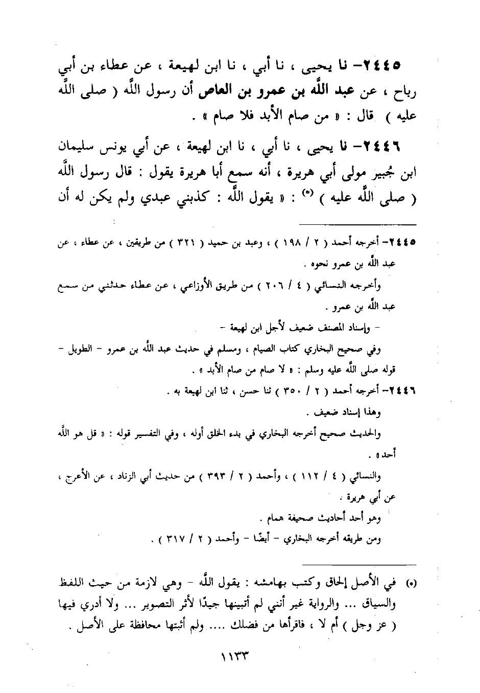 2445 - نا يَحْيَى، نا أَبِي، نا ابْنُ لَهِيعَةَ، عَنْ عَطَاءِ بْنِ أَبِي رَبَاحٍ، عَنْ عَبْدِ اللَّهِ بْنِ عَمْرِو بْنِ الْعَاصِ، أَنَّ رَسُولَ اللَّهِ صَلَّى اللَّهُ عَلَيْهِ قَالَ: «§مَنْ صَامَ الْأَبَدَ فَلَا صَامَ»