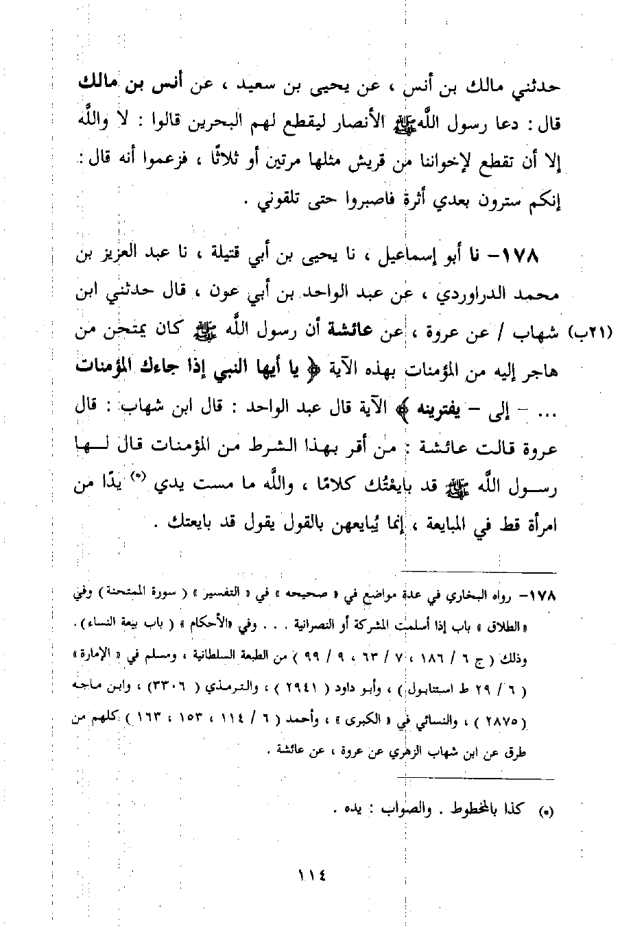 178 - نا أَبُو إِسْمَاعِيلَ، نا يَحْيَى بْنُ أَبِي قُتَيْلَةَ، نا عَبْدُ الْعَزِيزِ بْنُ مُحَمَّدٍ الدَّرَاوَرْدِيُّ، عَنْ عَبْدِ الْوَاحِدِ بْنِ أَبِي عَوْنٍ قَالَ: حَدَّثَنِي ابْنُ شِهَابٍ، عَنْ عُرْوَةَ، عَنْ عَائِشَةَ، أَنَّ رَسُولَ اللَّهِ صَلَّى اللَّهُ عَلَيْهِ وَسَلَّمَ كَانَ §يَمْتَحِنُ مَنْ هَاجَرَ إِلَيْهِ مِنَ الْمُؤْمِنَاتِ بِهَذِهِ الْآيَةِ {يَا أَيُّهَا النَّبِيُّ إِذَا جَاءَكَ الْمُؤْمِنَاتُ} [الممتحنة: 12] إِلَى {يَفْتَرِينَهُ} [الممتحنة: 12] الْآيَةَ، قَالَ عَبْدُ الْوَاحِدِ: قَالَ ابْنُ شِهَابٍ: قَالَ عُرْوَةُ: قَالَتْ عَائِشَةُ: مَنْ أَقَرَّ بِهَذَا الشَّرْطِ مِنَ الْمُؤْمِنَاتِ قَالَ لَهَا رَسُولُ اللَّهِ صَلَّى اللَّهُ عَلَيْهِ وَسَلَّمَ: «قَدْ بَايَعْتُكِ» كَلَامًا، وَاللَّهِ مَا مَسَّتْ يَدُهُ يَدًا مِنِ امْرَأَةٍ قَطُّ فِي الْمُبَايَعَةِ، إِنَّمَا يُبَايِعُهُنَّ بِالْقَوْلِ يَقُولُ: «قَدْ بَايَعْتُكِ»