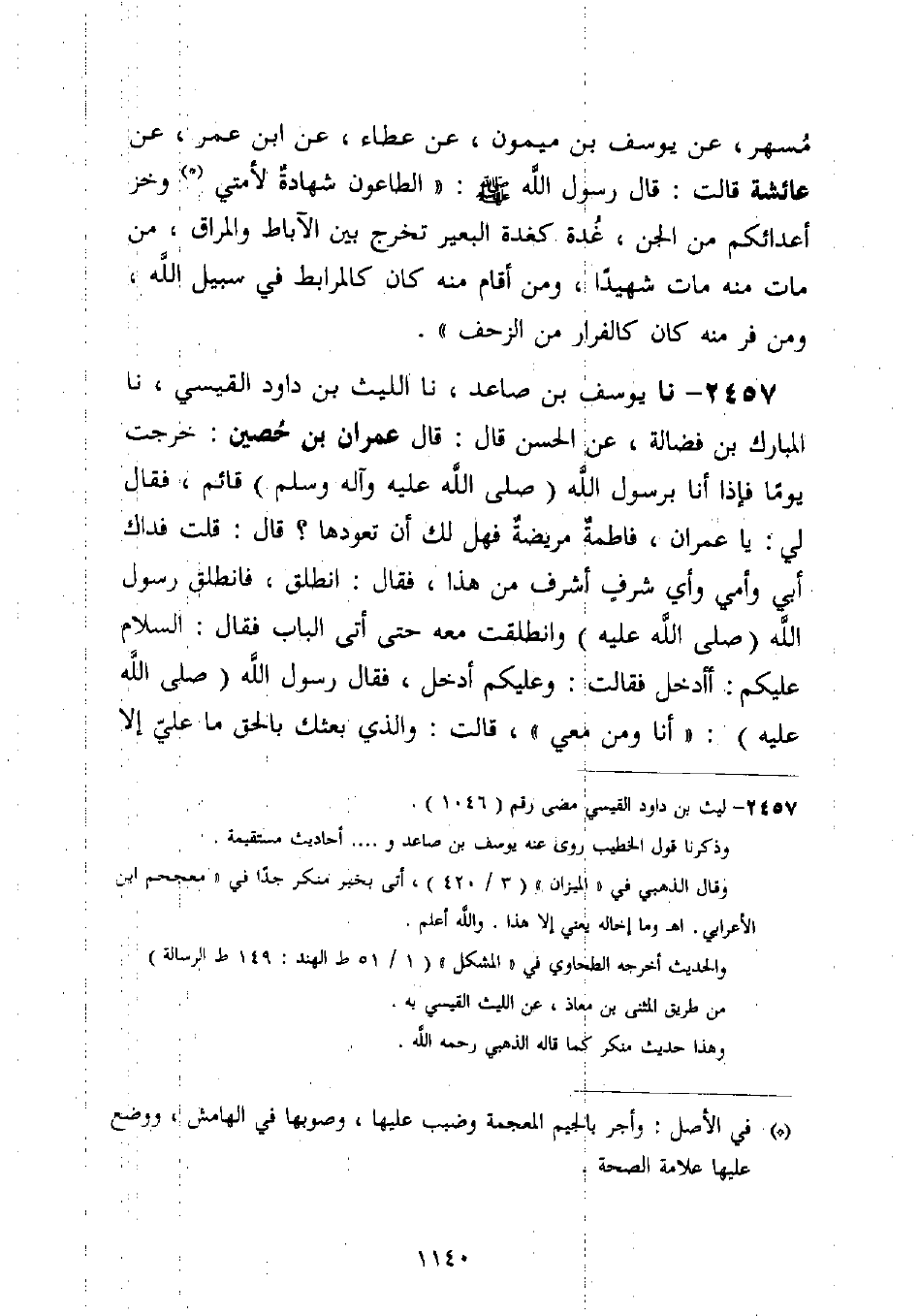 2457 - نا يُوسُفُ بْنُ صَاعِدٍ، نا اللَّيْثُ بْنُ دَاوُدَ الْقَيْسِيُّ، نا الْمُبَارَكُ بْنُ فَضَالَةَ، عَنِ الْحَسَنِ قَالَ: قَالَ عِمْرَانُ بْنُ حُصَيْنٍ: خَرَجْتُ يَوْمًا فَإِذَا أنا بِرَسُولِ اللَّهِ، صَلَّى اللَّهُ عَلَيْهِ وَآلِهِ وَسَلَّمَ قَائِمٌ، فَقَالَ لِي: «يَا عِمْرَانُ، §فَاطِمَةُ مَرِيضَةٌ، فَهَلْ لَكَ أَنْ تَعُودَهَا؟» قَالَ: قُلْتُ: فِدَاكَ أَبِي وَأُمِّي، وَأَيُّ شَرَفٍ أَشْرَفُ مِنْ هَذَا؟ فَقَالَ: «انْطَلِقْ»، فَانْطَلَقَ رَسُولُ اللَّهِ صَلَّى اللَّهُ عَلَيْهِ وَانْطَلَقْتُ مَعَهُ، حَتَّى أَتَى الْبَابَ فَقَالَ: «السَّلَامُ عَلَيْكُمْ، أَأَدْخُلُ؟» فَقَالَتْ: وَعَلَيْكَ، ادْخُلْ، فَقَالَ رَسُولُ اللَّهِ صَلَّى اللَّهُ عَلَيْهِ: «أَنَا وَمَنْ مَعِي؟» قَالَتْ: وَالَّذِي بَعَثَكَ بِالْحَقِّ، مَا عَلَيَّ إِلَّا -[1141]- هَذِهِ الْعَبَاءَةِ قَالَ: وَمَعَ رَسُولِ اللَّهِ صَلَّى اللَّهُ عَلَيْهِ مُلَاءَةٌ خَلْفَهُ، فَرَمَى بِهَا إِلَيْهَا وَقَالَ: شُدِّي بِهَا عَلَى رَأْسِكِ، فَفَعَلَتْ ثُمَّ قَالَتِ: ادْخُلْ. فَدَخَلَ، وَدَخَلْتُ مَعَهُ، فَقَعَدَ عِنْدَ رَأْسِهَا، وَقَعَدْتُ قَرِيبًا مِنْهَا، فَقَالَ: «يَا بُنَيَّةُ، كَيْفَ تَجِدُكِ؟» قَالَتْ: يَا رَسُولَ اللَّهِ، وَاللَّهِ إِنِّي لَوَجِعَةٌ، وَإِنَّهُ لَيَزِيدُنِي وَجَعٌ إِلَى وَجَعِي أَنْ لَيْسَ عِنْدِي مَا آكُلُ قَالَ: فَبَكَى رَسُولُ اللَّهِ صَلَّى اللَّهُ عَلَيْهِ وَسَلَّمَ، وَبَكَيْتُ مَعَهُمَا، فَقَالَ لَهَا: «أَيْ بُنَيَّةُ تَصَبَّرِي، أَيْ بُنَيَّةُ تَصَبَّرِي» مَرَّتَيْنِ أَوْ ثَلَاثَةً، ثُمَّ قَالَ لَهَا: «أَيْ بُنَيَّةُ، أَمَا تَرْضَيْنَ أَنْ تَكُونِي سَيِّدَةَ نِسَاءِ الْعَالَمِينَ؟» قَالَتْ: يَا لَيْتَهَا مَاتَتْ، فَأَيْنَ مَرْيَمُ بِنْتُ عِمْرَانَ؟ قَالَ: أَيْ بُنَيَّةُ، تِلْكَ سَيِّدَةُ نِسَاءِ عَالَمِهَا، وَأَنْتِ سَيِّدَةُ نِسَاءِ عَالَمِكِ، وَالَّذِي نَفْسِي بِيَدِهِ، لَقَدْ زَوَّجْتُكِ سَيِّدًا فِي الدُّنْيَا وَسَيِّدًا فِي الْآخِرَةِ، لَا يُبْغِضُهُ إِلَّا مُنَافِقٌ "