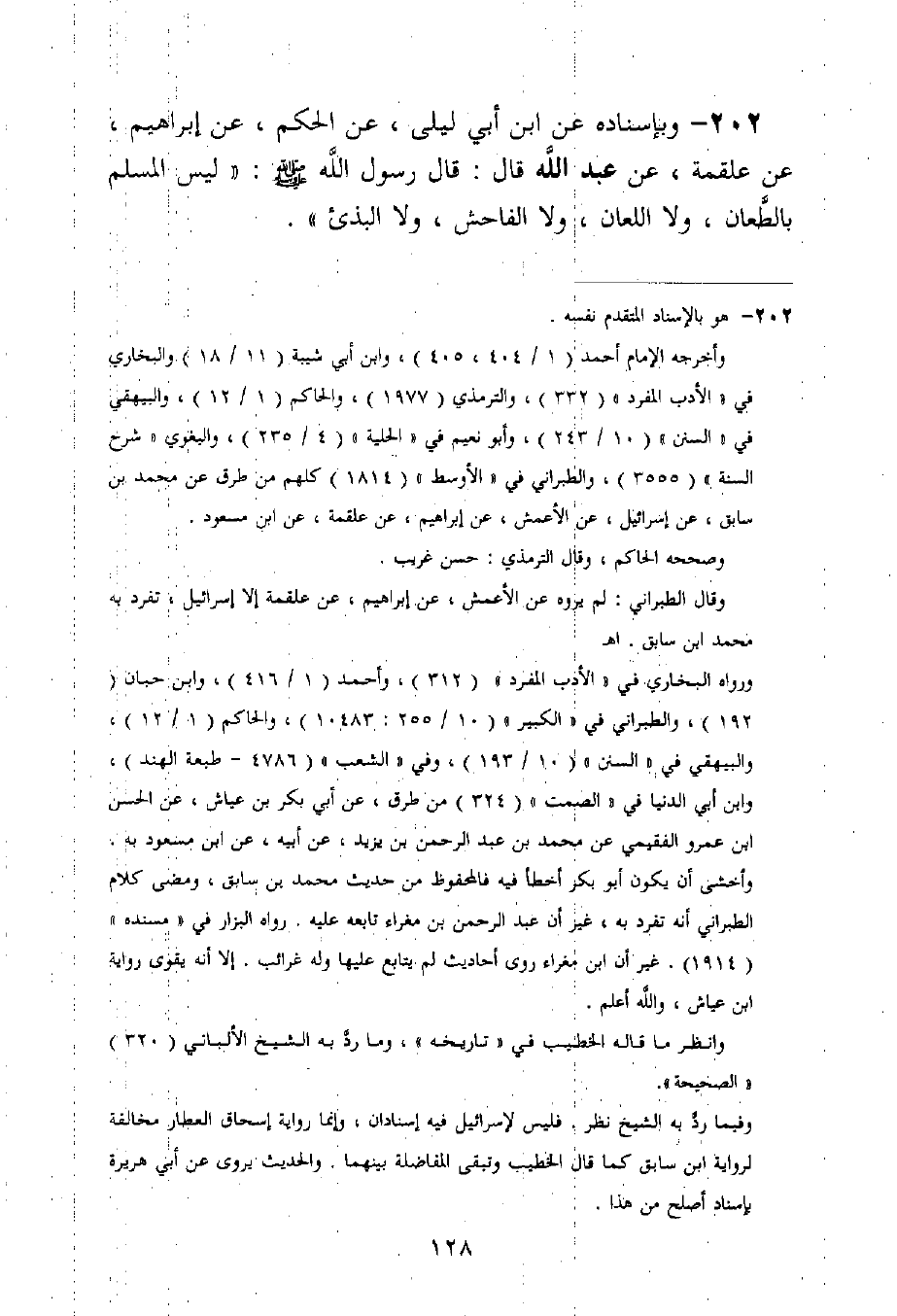 202 - وَبِإِسْنَادِهِ عَنِ ابْنِ أَبِي لَيْلَى، عَنِ الْحَكَمِ، عَنْ إِبْرَاهِيمَ، عَنْ عَلْقَمَةَ، عَنْ عَبْدِ اللَّهِ قَالَ: قَالَ رَسُولُ اللَّهِ صَلَّى اللَّهُ عَلَيْهِ وَسَلَّمَ: «§لَيْسَ الْمُسْلِمُ بِالطَّعَّانِ، وَلَا اللِّعَانِ، وَلَا الْفَاحِشِ، وَلَا الْبَذِيءِ»