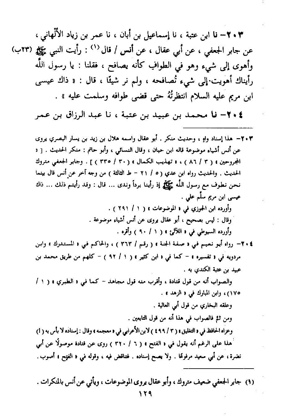 203 - نا ابْنُ عُتْبَةَ، نا إِسْمَاعِيلُ بْنُ أَبَانَ، نا عُمَرُ بْنُ زِيَادٍ الْأَلْهَانِيُّ، عَنْ جَابِرٍ الْجُعْفِيِّ، عَنْ أَبِي عِقَالٍ، عَنْ أَنَسٍ قَالَ: رَأَيْتُ النَّبِيَّ صَلَّى اللَّهُ عَلَيْهِ وَسَلَّمَ وَأَهْوَى إِلَى شَيْءٍ وَهُوَ فِي الطَّوَافِ كَأَنَّهُ يُصَافِحُ، فَقُلْنَا: يَا رَسُولَ اللَّهِ، رَأَيْنَاكَ أَهْوَيْتَ إِلَى شَيْءٍ تُصَافِحُهُ، وَلَمْ نَرَ شَيْئًا قَالَ: «§ذَاكَ عِيسَى ابْنُ مَرْيَمَ عَلَيْهِ السَّلَامُ انْتَظَرْتُهُ حَتَّى قَضَى طَوَافَهُ وَسَلَّمْتُ عَلَيْهِ»