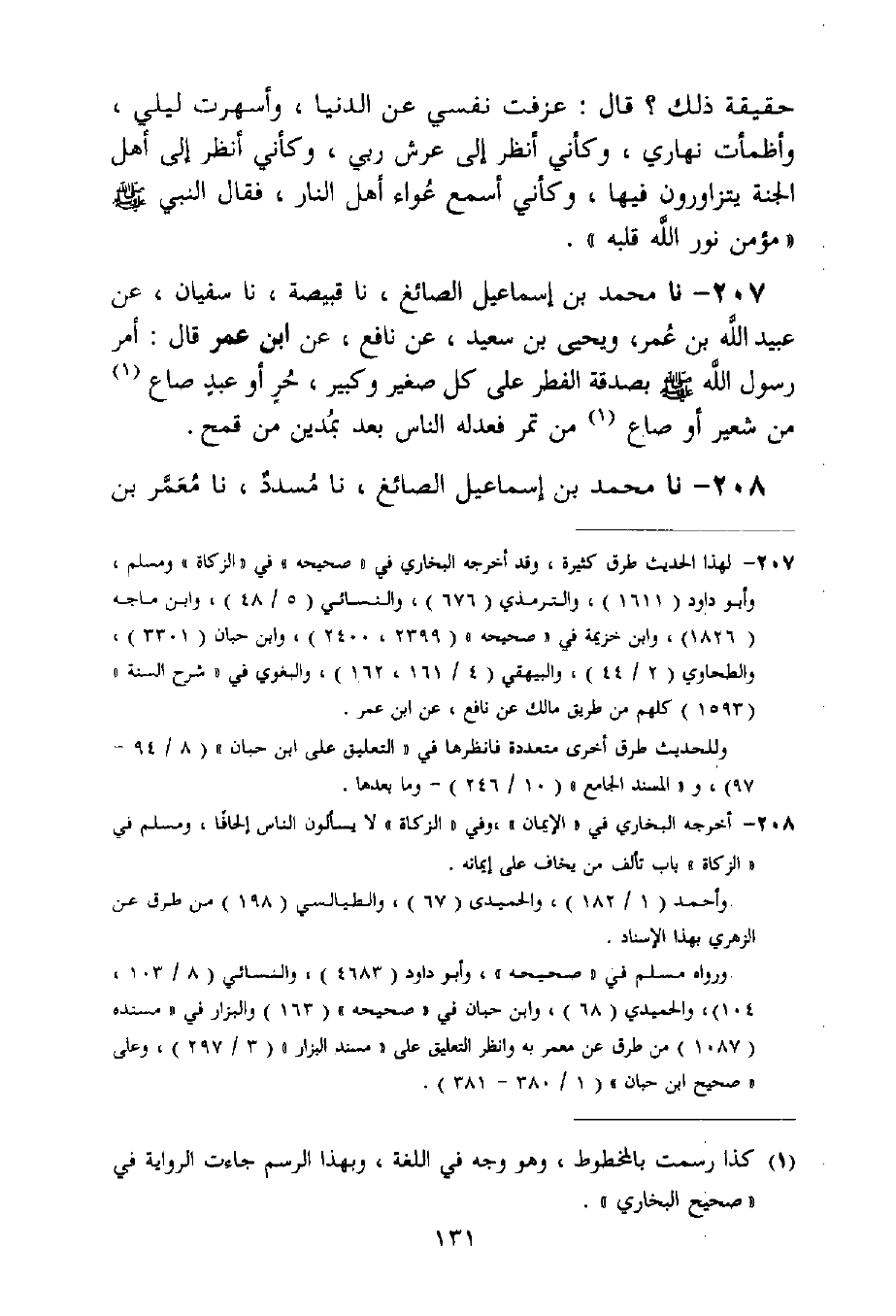 207 - نا مُحَمَّدُ بْنُ إِسْمَاعِيلَ الصَّائِغُ، نا قَبِيصَةُ، نا سُفْيَانُ، عَنْ عُبَيْدِ اللَّهِ بْنِ عُمَرَ، وَيَحْيَى بْنِ سَعِيدٍ، عَنْ نَافِعٍ، عَنِ ابْنِ عُمَرَ قَالَ: «§أَمَرَ رَسُولُ اللَّهِ صَلَّى اللَّهُ عَلَيْهِ وَسَلَّمَ بِصَدَقَةِ الْفِطْرِ عَلَى كُلِّ صَغِيرٍ وَكَبِيرٍ، حُرٍّ أَوْ عَبْدٍ صَاعٍ مِنْ شَعِيرٍ أَوْ صَاعٍ مِنْ تَمْرٍ فَعَدَلَهُ النَّاسُ بَعْدُ بِمُدَّيْنِ مِنْ قَمْحٍ»