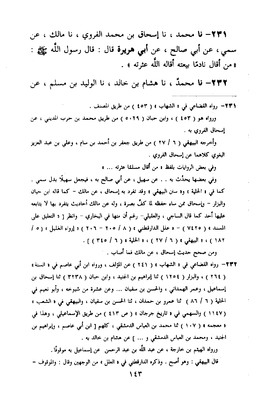231 - نا مُحَمَّدٌ، نا إِسْحَاقُ بْنُ مُحَمَّدٍ الْفَرْوِيُّ، نا مَالِكٌ، عَنْ سُمَيٍّ، عَنْ أَبِي صَالِحٍ، عَنْ أَبِي هُرَيْرَةَ قَالَ: قَالَ رَسُولُ اللَّهِ صَلَّى اللَّهُ عَلَيْهِ وَسَلَّمَ: «§مَنْ أَقَالَ نَادِمًا بَيْعَتَهُ أَقَالَهُ اللَّهُ عَثْرَتَهُ»