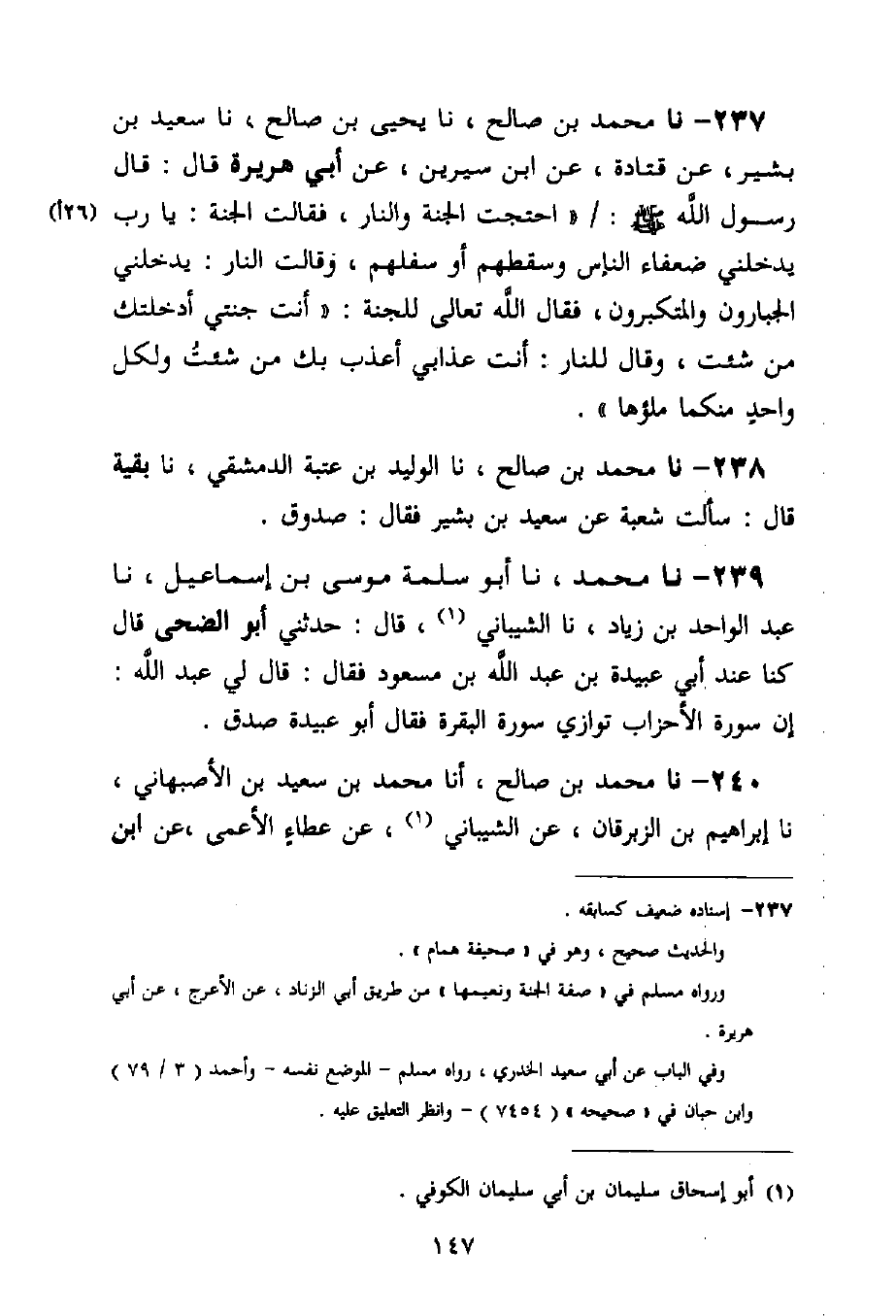 237 - نا مُحَمَّدُ بْنُ صَالِحٍ، نا يَحْيَى بْنُ صَالِحٍ، نا سَعِيدُ بْنُ بَشِيرٍ، عَنْ قَتَادَةَ، عَنِ ابْنِ سِيرِينَ، عَنْ أَبِي هُرَيْرَةَ قَالَ: قَالَ رَسُولُ اللَّهِ صَلَّى اللَّهُ عَلَيْهِ وَسَلَّمَ: " §احْتَجَّتِ الْجَنَّةُ وَالنَّارُ، فَقَالَتِ الْجَنَّةُ: يَا رَبِّ يَدْخُلُنِي ضُعَفَاءُ النَّاسِ وَسَقَطُهُمْ أَوْ سَفَلُهُمْ، وَقَالَتِ النَّارُ: يَدْخُلُنِي الْجَبَّارُونَ وَالْمُتَكَبِّرُونَ، فَقَالَ اللَّهُ تَعَالَى لِلْجَنَّةِ: " أَنْتِ جَنَّتِي أَدْخَلْتُكِ مَنْ شِئْتُ، وَقَالَ لِلنَّارِ: أَنْتِ عَذَابِي أُعَذِّبُ بِكِ مَنْ شِئْتِ وَلِكُلِّ وَاحِدٍ مِنْكُمَا مِلْؤُهَا "