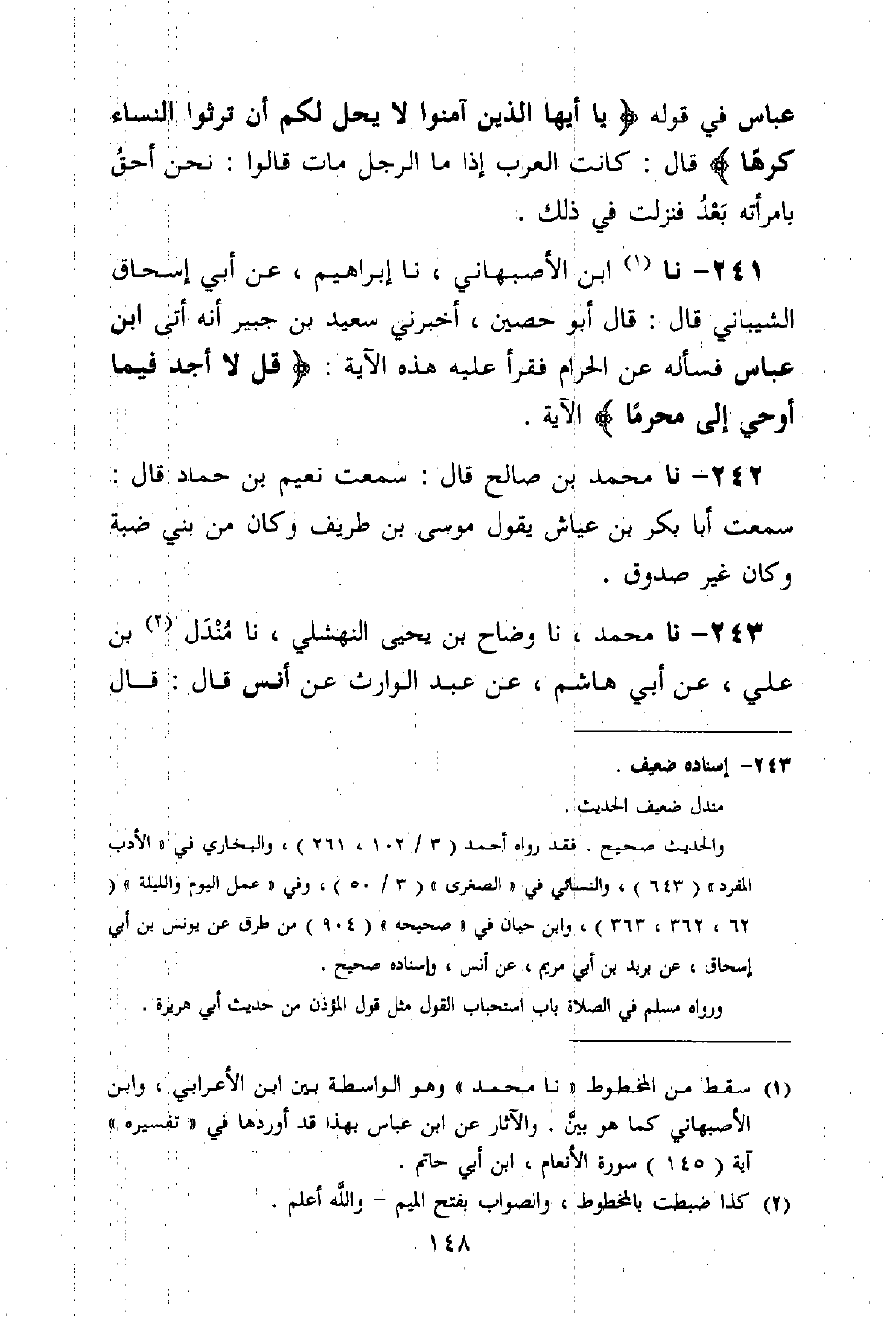 241 - نا مُحَمَّدٌ نا ابْنُ الْأَصْبَهَانِيِّ، نا إِبْرَاهِيمُ، عَنْ أَبِي إِسْحَاقَ الشَّيْبَانِيِّ قَالَ: قَالَ أَبُو حُصَيْنٍ، أَخْبَرَنِي سَعِيدُ بْنُ جُبَيْرٍ، أَنَّهُ أَتَى ابْنَ عَبَّاسٍ §فَسَأَلَهُ عَنِ الْحَرَامِ، فَقَرَأَ عَلَيْهِ هَذِهِ الْآيَةَ: {قُلْ لَا أَجِدُ فِي مَا أُوحِيَ إِلَيَّ مُحَرَّمًا} [الأنعام: 145] الْآيَةَ