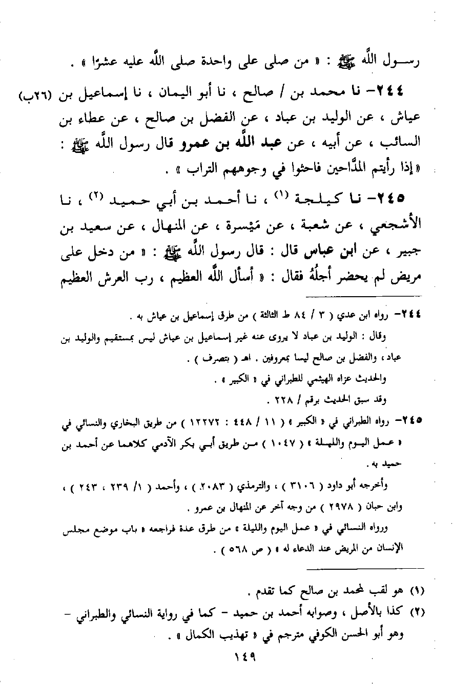244 - نا مُحَمَّدُ بْنُ صَالِحٍ، نا أَبُو الْيَمَانِ، نا إِسْمَاعِيلُ بْنُ عَيَّاشٍ، عَنِ الْوَلِيدِ بْنِ عَبَّادٍ، عَنِ الْفَضْلِ بْنِ صَالِحٍ، عَنْ عَطَاءِ بْنِ السَّائِبِ، عَنْ أَبِيهِ، عَنْ عَبْدِ اللَّهِ بْنِ عَمْرٍو قَالَ رَسُولُ اللَّهِ صَلَّى اللَّهُ عَلَيْهِ وَسَلَّمَ: «§إِذَا رَأَيْتُمُ الْمَدَّاحِينَ فَاحْثُوا فِي وُجُوهِهِمُ التُّرَابَ»