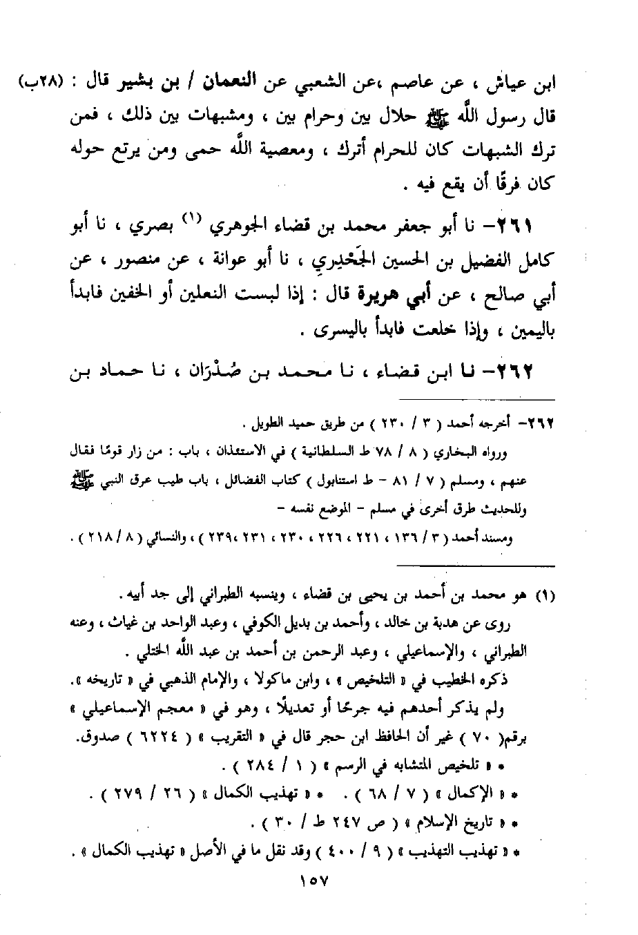 261 - نا أَبُو جَعْفَرٍ مُحَمَّدُ بْنُ قَضَاءٍ الْجَوْهَرِيُّ بَصْرِيٌّ، نا أَبُو كَامِلٍ الْفُضَيْلُ بْنُ الْحُسَيْنِ الْجَحْدَرِيُّ، نا أَبُو عَوَانَةَ، عَنْ مَنْصُورٍ، عَنْ أَبِي صَالِحٍ، عَنْ أَبِي هُرَيْرَةَ قَالَ: «§إِذَا لَبِسْتَ النَّعْلَيْنِ أَوِ الْخُفَّيْنِ فَابْدَأْ بِالْيَمِينِ، وَإِذَا خَلَعْتَ فَابْدَأْ بِالْيُسْرَى»