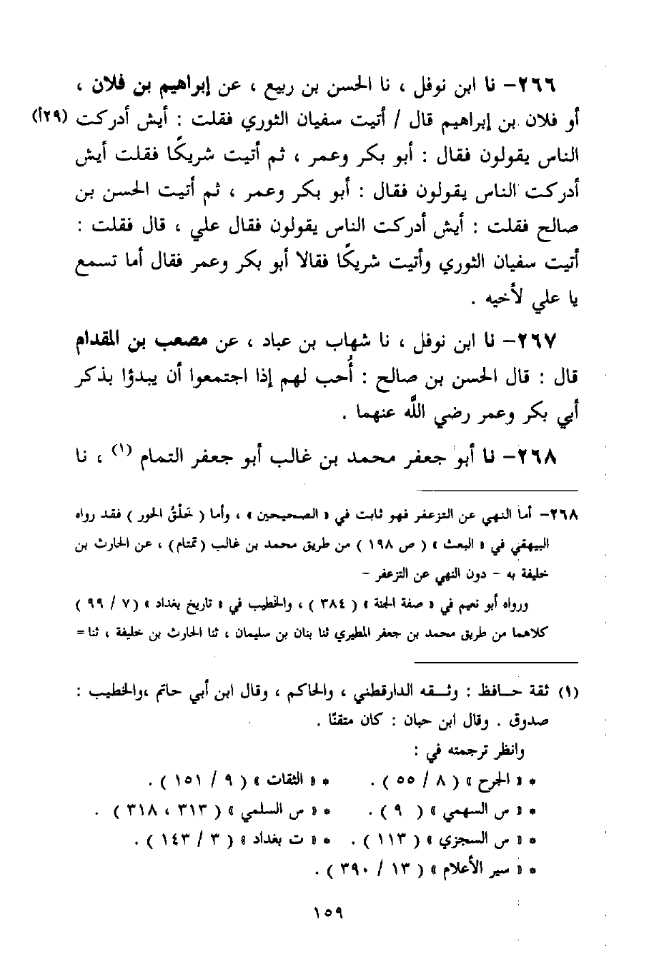 267 - نا ابْنُ نَوْفَلٍ، نا شِهَابُ بْنُ عَبَّادٍ، عَنْ مُصْعَبِ بْنِ الْمِقْدَامِ قَالَ: قَالَ الْحَسَنُ بْنُ صَالِحٍ: «§أُحِبُّ لَهُمْ إِذَا اجْتَمَعُوا أَنْ يَبْدَءُوا بِذِكْرِ أَبِي بَكْرٍ وَعُمَرَ رَضِيَ اللَّهُ عَنْهُمَا»