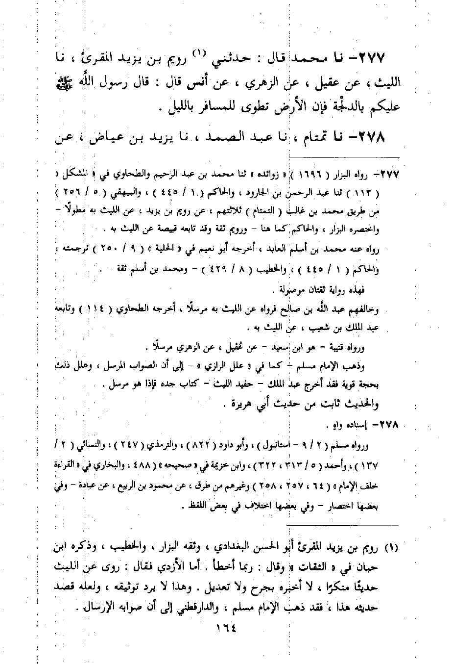 277 - نا مُحَمَّدٌ قَالَ: حَدَّثَنِي رُوَيْمُ بْنُ يَزِيدَ الْمُقْرِئُ، نا اللَّيْثُ، عَنْ عُقَيْلٍ، عَنِ الزُّهْرِيِّ، عَنْ أَنَسٍ قَالَ: قَالَ رَسُولُ اللَّهِ صَلَّى اللَّهُ عَلَيْهِ وَسَلَّمَ: «§عَلَيْكُمْ بِالدُّلْجَةِ فَإِنَّ الْأَرْضَ تُطْوَى لِلْمُسَافِرِ بِاللَّيْلِ»