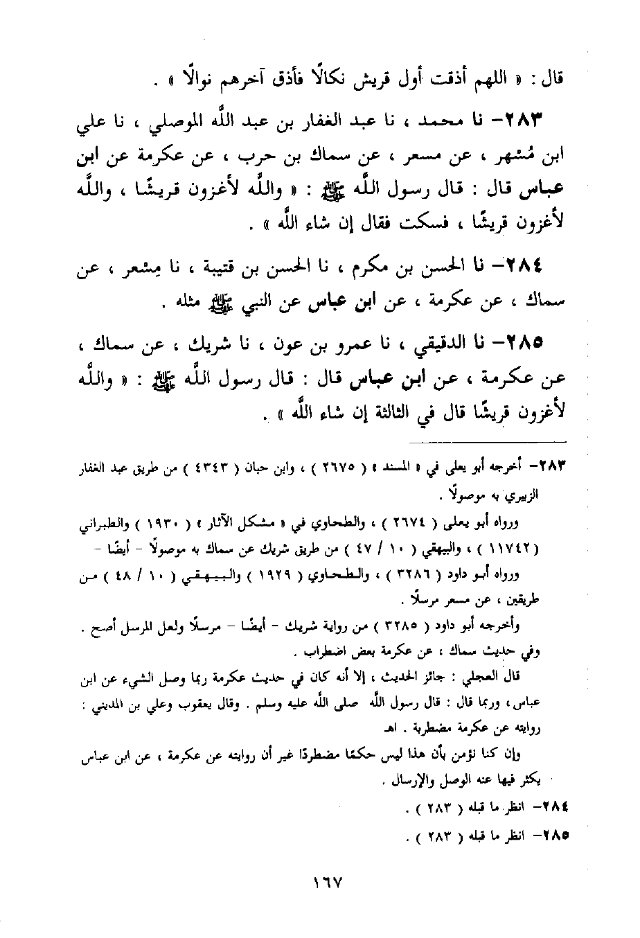 283 - نا مُحَمَّدٌ، نا عَبْدُ الْغَفَّارِ بْنُ عَبْدِ اللَّهِ الْمَوْصِلِيُّ، نا عَلِيُّ بْنُ مُسْهِرٍ، عَنْ مِسْعَرٍ، عَنْ سِمَاكِ بْنِ حَرْبٍ، عَنْ عِكْرِمَةَ، عَنِ ابْنِ عَبَّاسٍ قَالَ: قَالَ رَسُولُ اللَّهِ صَلَّى اللَّهُ عَلَيْهِ وَسَلَّمَ: " وَاللَّهِ §لَأَغْزُوَنَّ قُرَيْشًا، وَاللَّهِ لَأَغْزُوَنَّ قُرَيْشًا، فَسَكَتَ فَقَالَ: إِنْ شَاءَ اللَّهُ "