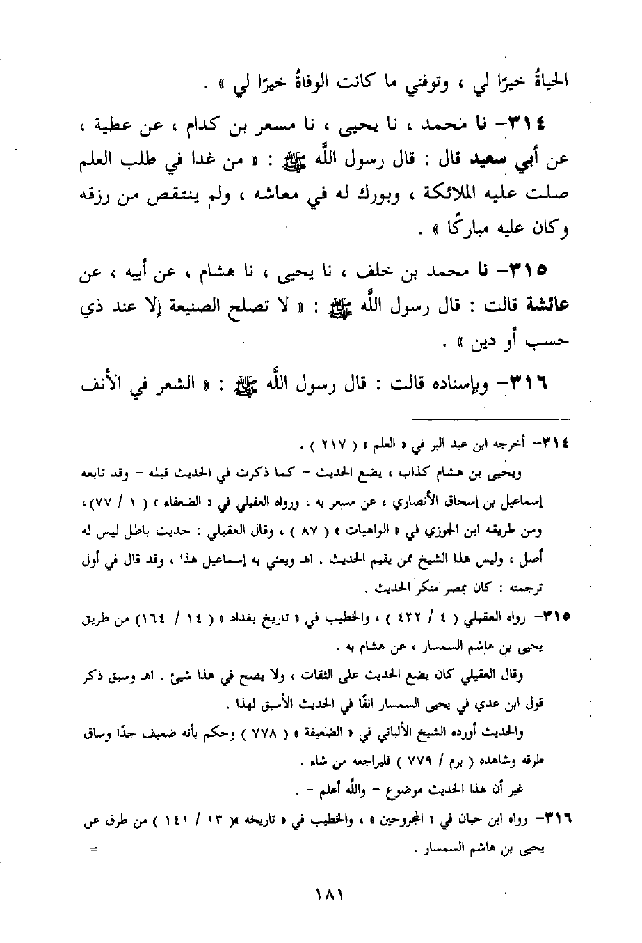 314 - نا مُحَمَّدٌ، نا يَحْيَى، نا مِسْعَرُ بْنُ كِدَامٍ، عَنْ عَطِيَّةَ، عَنْ أَبِي سَعِيدٍ قَالَ: قَالَ رَسُولُ اللَّهِ صَلَّى اللَّهُ عَلَيْهِ وَسَلَّمَ: «§مَنْ غَدَا فِي طَلَبِ الْعِلْمِ صَلَّتْ عَلَيْهِ الْمَلَائِكَةُ، وَبُورِكَ لَهُ فِي مَعَاشِهِ، وَلَمْ يُنْتَقَصْ مِنْ رِزْقِهِ وَكَانَ عَلَيْهِ مُبَارَكًا»