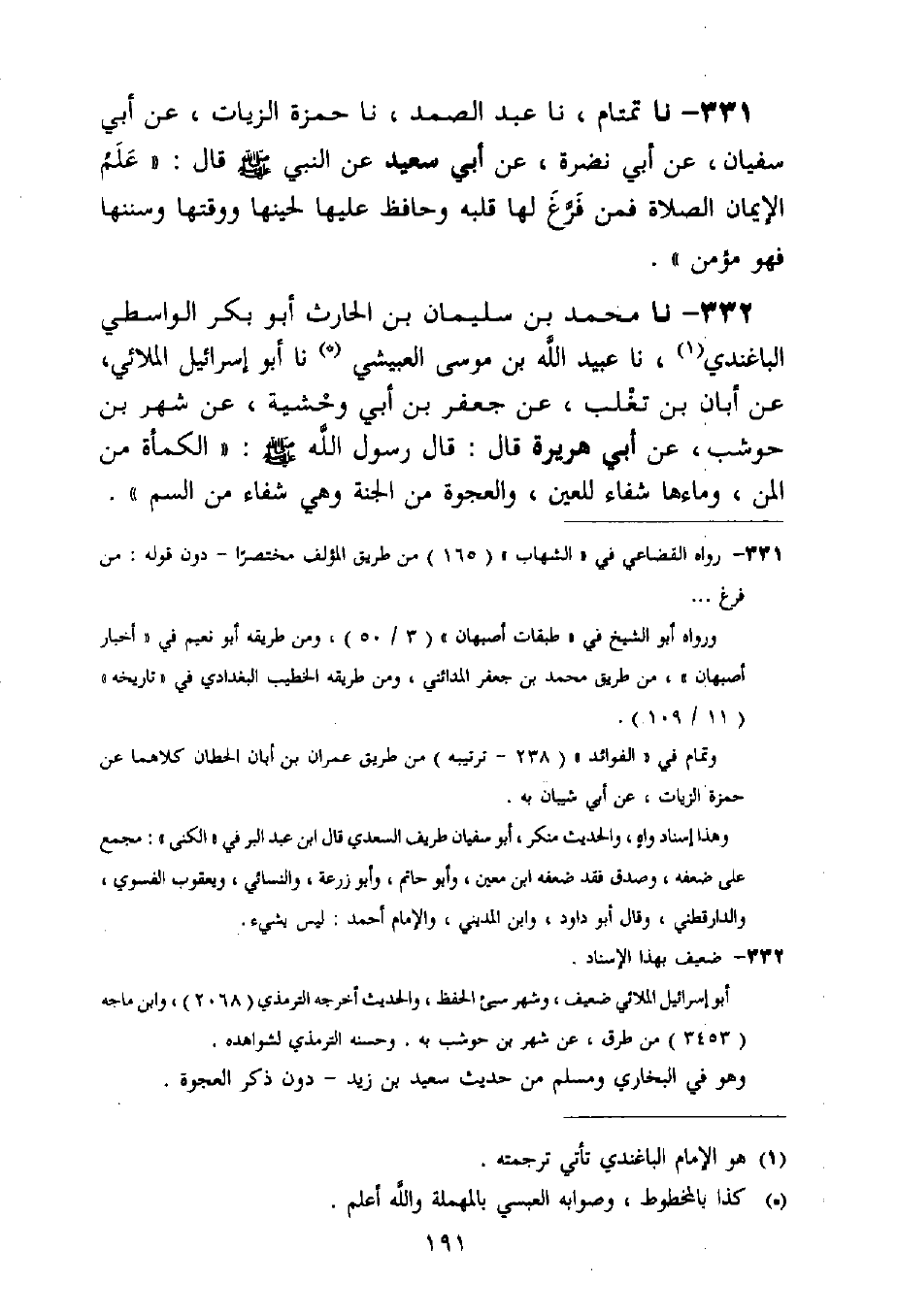 332 - نا مُحَمَّدُ بْنُ سُلَيْمَانَ بْنِ الْحَارِثِ أَبُو بَكْرٍ الْوَاسِطِيُّ الْبَاغَنْدِيُّ، نا عُبَيْدُ اللَّهِ بْنُ مُوسَى الْعَبْسِيُّ، نا أَبُو إِسْرَائِيلَ الْمُلَائِيُّ، عَنْ أَبَانَ بْنِ تَغْلِبَ، عَنْ جَعْفَرِ بْنِ أَبِي وَحْشِيَّةَ، عَنْ شَهْرِ بْنِ حَوْشَبٍ، عَنْ أَبِي هُرَيْرَةَ قَالَ: قَالَ رَسُولُ اللَّهِ صَلَّى اللَّهُ عَلَيْهِ وَسَلَّمَ: «§الْكَمْأَةُ مِنَ الْمَنِّ، وَمَاؤُهَا شِفَاءٌ لِلْعَيْنِ، وَالْعَجْوَةُ مِنَ الْجَنَّةِ وَهِيَ شِفَاءٌ مِنَ السُّمِّ»