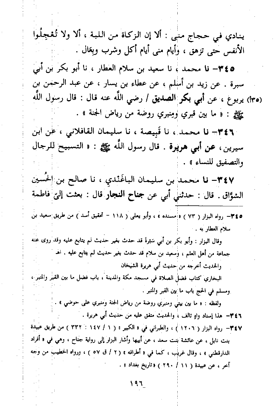 345 - نا مُحَمَّدٌ، نا سَعِيدُ بْنُ سَلَّامٍ الْعَطَّارُ، نا أَبُو بَكْرِ بْنُ أَبِي سَبْرَةَ، عَنْ زَيْدِ بْنِ أَسْلَمَ، عَنْ عَطَاءِ بْنِ يَسَارٍ، عَنْ عَبْدِ الرَّحْمَنِ بْنِ يَرْبُوعٍ، عَنْ أَبِي بَكْرٍ الصِّدِّيقِ رَضِيَ اللَّهُ عَنْهُ قَالَ: قَالَ رَسُولُ اللَّهِ صَلَّى اللَّهُ عَلَيْهِ وَسَلَّمَ: «§مَا بَيْنَ قَبْرِي وَمِنْبَرِي رَوْضَةٌ مِنْ رِيَاضِ الْجَنَّةِ»