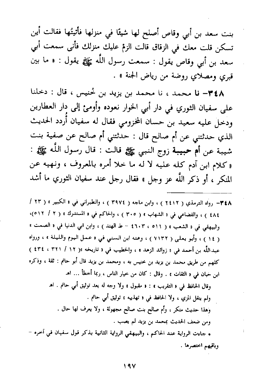 348 - نا مُحَمَّدٌ، نا مُحَمَّدُ بْنُ يَزِيدَ بْنِ خُنَيْسٍ قَالَ: دَخَلْنَا عَلَى سُفْيَانَ الثَّوْرِيِّ فِي دَارِ أَبِي الْخُوَارِ نَعُودُهُ وَأَوْمَأَ إِلَى دَارِ الْعَطَّارِينَ وَدَخَلَ عَلَيْهِ سَعِيدُ بْنُ حَسَّانَ الْمَخْزُومِيُّ فَقَالَ لَهُ سُفْيَانُ ارْدُدِ الْحَدِيثَ الَّذِي حَدَّثْتَنِي عَنْ أُمِّ صَالِحٍ قَالَ: حَدَّثَتْنِي أُمُّ صَالِحٍ عَنْ صَفِيَّةَ بِنْتِ شَيْبَةَ، عَنْ أُمِّ حَبِيبَةَ زَوْجِ النَّبِيِّ صَلَّى اللَّهُ عَلَيْهِ وَسَلَّمَ قَالَتْ: قَالَ رَسُولُ اللَّهِ صَلَّى اللَّهُ عَلَيْهِ وَسَلَّمَ: «§كَلَامُ ابْنِ آدَمَ كُلُّهُ عَلَيْهِ لَا لَهُ مَا خَلَا أَمْرَهُ بِالْمَعْرُوفِ، وَنَهْيَهُ عَنِ الْمُنْكَرِ، أَوْ ذِكْرَ اللَّهِ عَزَّ وَجَلَّ» فَقَالَ رَجُلٌ عِنْدَ سُفْيَانَ الثَّوْرِيِّ: مَا أَشَدَّ -[198]- هَذَا الْحَدِيثَ قَالَ أَبُو بَكْرٍ: قَالَ لِي أَهْلُ مَكَّةَ: كَانَ مُحَمَّدُ بْنُ يَزِيدَ الَّذِي قَالَ هَذَا الْقَوْلَ قَالَ: فَقَالَ سُفْيَانُ الثَّوْرِيُّ: وَمَا شِدَّتُهُ؟ أَوَمَا سَمِعْتَ اللَّهَ يَقُولُ فِي كِتَابِهِ {لَا خَيْرَ فِي كَثِيرٍ مِنْ نَجْوَاهُمْ} [النساء: 114] إِلَّا مَنْ أَمَرَ بِصَدَقَةٍ أَوْ مَعْرُوفٍ أَوْ إِصْلَاحٍ بَيْنَ النَّاسِ فَهَذَا هُوَ بِعَيْنِهِ، أَوَمَا سَمِعْتَ اللَّهَ يَقُولُ فِي كِتَابِهِ {يَوْمَ يَقُومُ الرُّوحُ وَالْمَلَائِكَةُ صَفًّا لَا يَتَكَلَّمُونَ إِلَّا مَنْ أَذِنَ لَهُ الرَّحْمَنُ وَقَالَ صَوَابًا} [النبأ: 38] أَوَمَا سَمِعْتَ اللَّهَ يَقُولُ فِي كِتَابِهِ {وَالْعَصْرِ إِنَّ الْإِنْسَانَ لَفِي خُسْرٍ إِلَّا الَّذِينَ آمَنُوا وَعَمِلُوا الصَّالِحَاتِ وَتَوَاصَوْا بِالْحَقِّ وَتَوَاصَوْا بِالصَّبِرِ} [العصر: 2] فَهَذَا هُوَ بِعَيْنِهِ