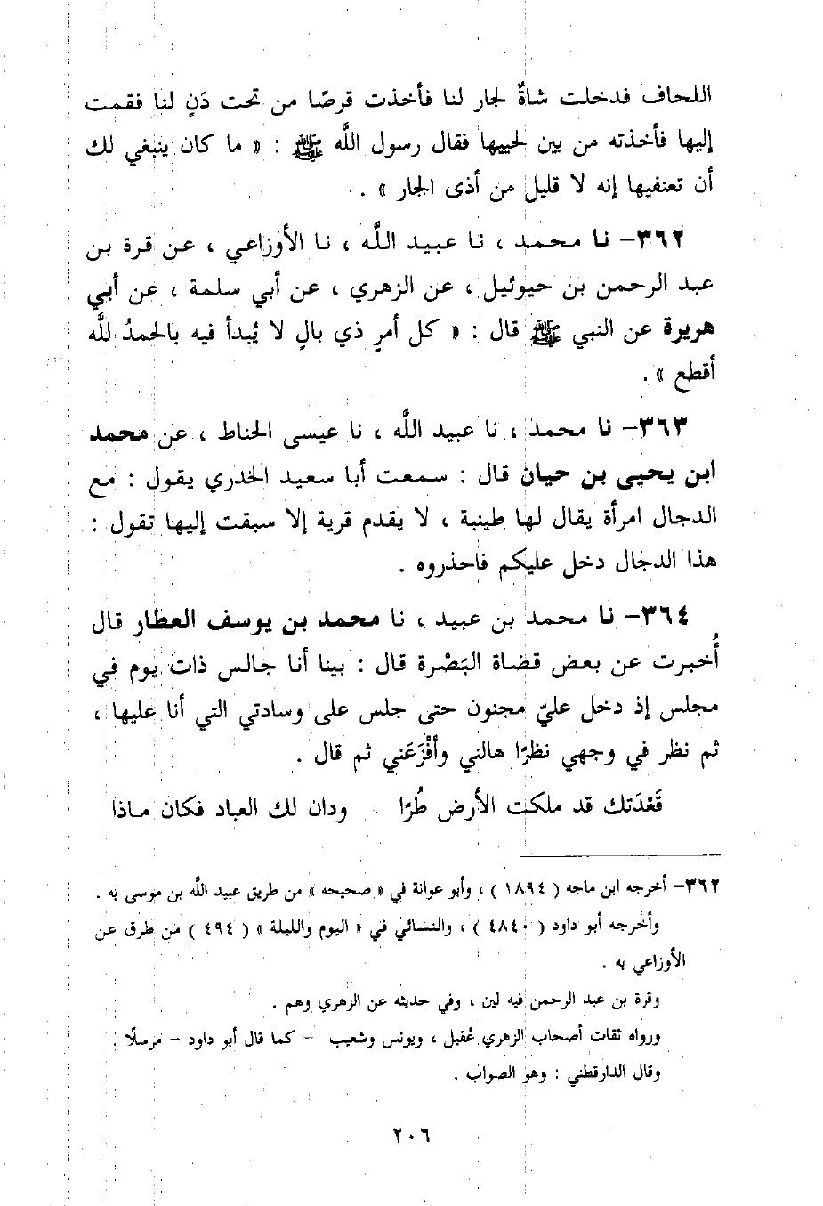 362 - نا مُحَمَّدٌ، نا عُبَيْدُ اللَّهِ، نا الْأَوْزَاعِيُّ، عَنْ قُرَّةَ بْنِ عَبْدِ الرَّحْمَنِ بْنِ حَيْوَئِيلَ، عَنِ الزُّهْرِيِّ، عَنْ أَبِي سَلَمَةَ، عَنْ أَبِي هُرَيْرَةَ، عَنِ النَّبِيِّ صَلَّى اللَّهُ عَلَيْهِ وَسَلَّمَ قَالَ: «§كُلُّ أَمْرٍ ذِي بَالٍ لَا يُبْدَأُ فِيهِ بِالْحَمْدِ لِلَّهِ أَقْطَعُ»