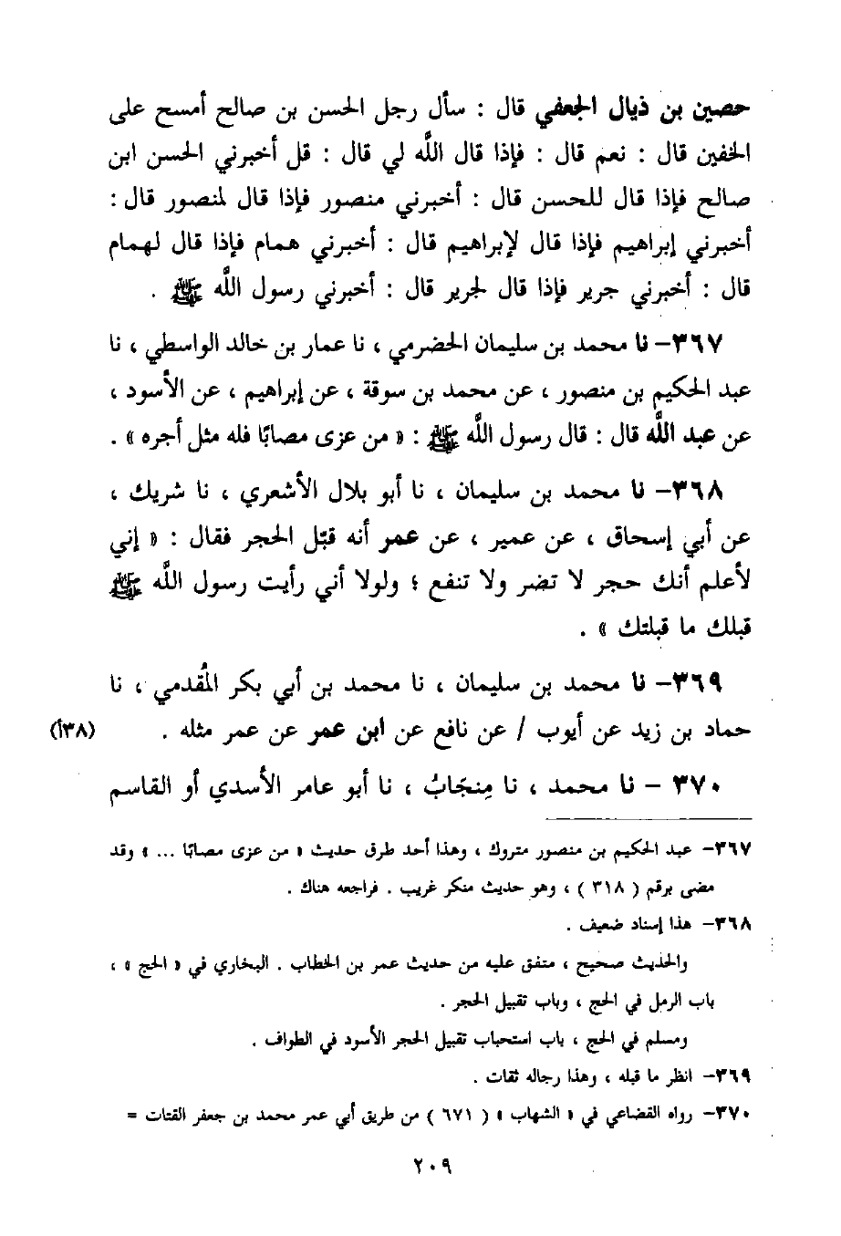 368 - نا مُحَمَّدُ بْنُ سُلَيْمَانَ، نا أَبُو بِلَالٍ الْأَشْعَرِيُّ، نا شَرِيكُ، عَنْ أَبِي إِسْحَاقَ، عَنْ عُمَيْرٍ، عَنْ عُمَرَ، أَنَّهُ قَبَّلَ الْحَجَرَ فَقَالَ: «إِنِّي §لَأَعْلَمُ أَنَّكَ حَجَرٌ لَا تَضُرُّ وَلَا تَنْفَعُ، وَلَوْلَا أَنِّي رَأَيْتُ رَسُولَ اللَّهِ صَلَّى اللَّهُ عَلَيْهِ وَسَلَّمَ قَبَّلَكَ مَا قَبَّلْتُكَ»