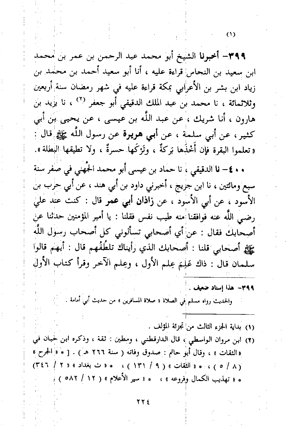 399 - أَخْبَرَنَا الشَّيْخُ أَبُو مُحَمَّدٍ عَبْدُ الرَّحْمَنِ بْنُ عُمَرَ بْنِ مُحَمَّدِ بْنِ سَعِيدِ بْنِ النَّحَّاسِ قِرَاءَةً عَلَيْهِ، أَنَا أَبُو سَعِيدٍ أَحْمَدُ بْنُ مُحَمَّدِ بْنِ زِيَادِ بْنِ بِشْرِ بْنِ الْأّعْرَابِيِّ بِمَكَّةَ قِرَاءَةً عَلَيْهِ فِي شَهْرِ رَمَضَانَ سَنَةَ أَرْبَعِينَ وَثَلاثِمِائَةٍ نا مُحَمَّدُ بْنُ عَبْدِ الْمَلِكِ الدَّقِيقِيُّ أَبُو جَعْفَرٍ، نا يَزِيدُ بْنُ هَارُونَ، أنا شَرِيكٌ، عَنْ عَبْدِ اللَّهِ بْنِ عِيسَى، عَنْ يَحْيَى بْنِ أَبِي كَثِيرٍ، عَنْ أَبِي سَلَمَةَ، عَنْ أَبِي هُرَيْرَةَ، عَنْ رَسُولِ اللَّهِ صَلَّى اللَّهُ عَلَيْهِ وَسَلَّمَ قَالَ: «§تَعَلَّمُوا الْبَقَرَةَ فَإِنَّ أَخْذَهَا بَرَكَةٌ، وَتَرْكَهَا حَسْرَةٌ، وَلَا تُطِيقُهَا الْبَطَلَةُ»