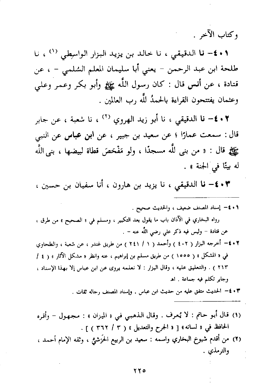 401 - نا الدَّقِيقِيُّ، نا خَالِدُ بْنُ يَزِيدَ الْبَزَّارُ الْوَاسِطِيُّ، نا طَلْحَةُ بْنُ عَبْدِ الرَّحْمَنِ يَعْنِي أَبَا سُلَيْمَانَ. . . السُّلَمِيُّ، عَنْ قَتَادَةَ، عَنْ أَنَسٍ قَالَ: كَانَ رَسُولُ اللَّهِ صَلَّى اللَّهُ عَلَيْهِ وَسَلَّمَ وَأَبُو بَكْرٍ وَعُمَرُ وَعَلِيٌّ وَعُثْمَانُ §يَفْتَتِحُونَ الْقِرَاءَةَ بِ {الْحَمْدُ لِلَّهِ رَبِّ الْعَالَمِينَ} [الفاتحة: 2]