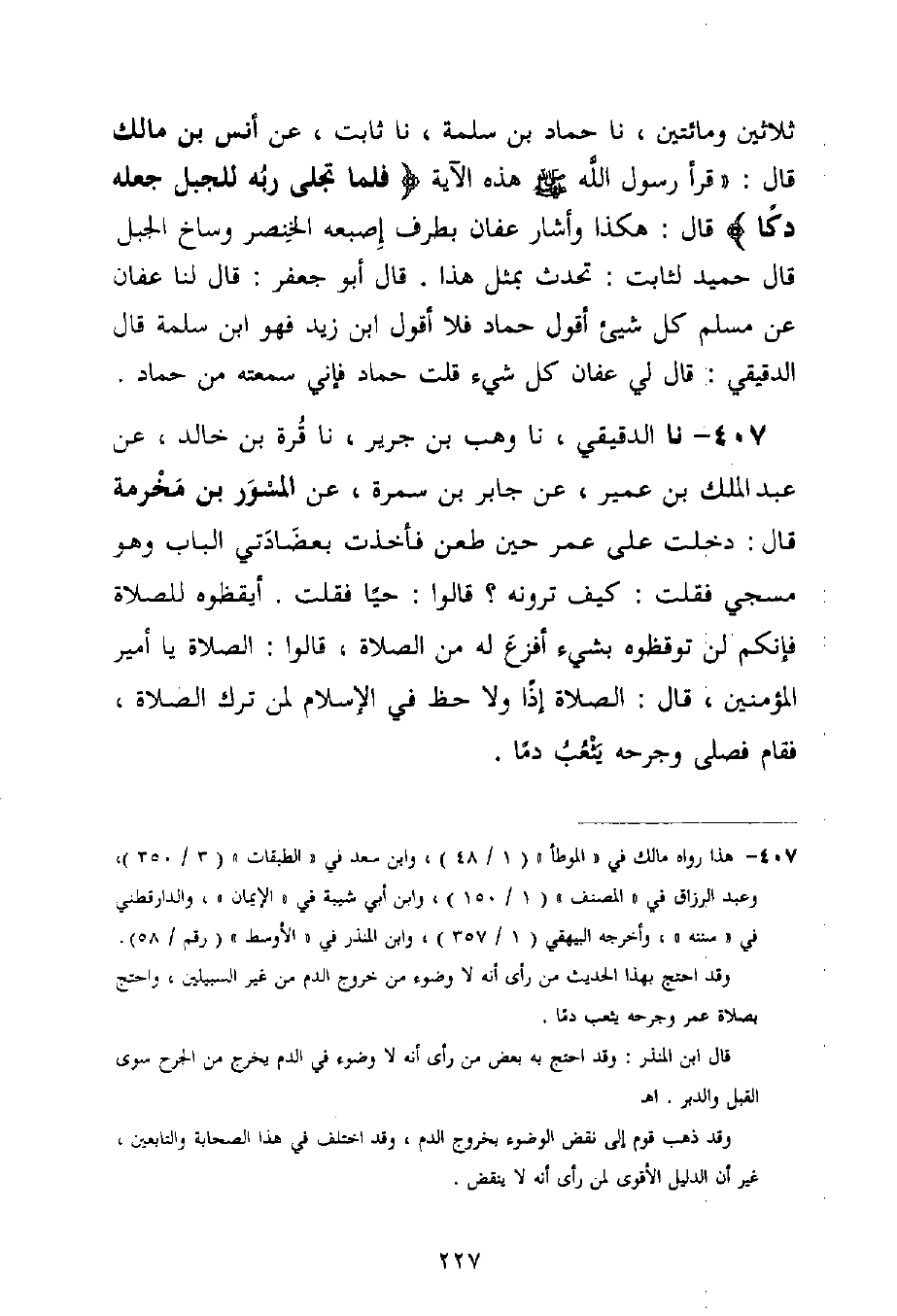 407 - نا الدَّقِيقِيُّ، نا وَهْبُ بْنُ جَرِيرٍ، نا قُرَّةُ بْنُ خَالِدٍ، عَنْ عَبْدِ الْمَلِكِ بْنِ عُمَيْرٍ، عَنْ جَابِرِ بْنِ سَمُرَةَ، عَنِ الْمِسْوَرِ بْنِ مَخْرَمَةَ قَالَ: دَخَلْتُ عَلَى عُمَرَ حِينَ طُعِنَ فَأَخَذْتُ بِعِضَادَتَيِ الْبَابِ وَهُوَ مُسَجًّى فَقُلْتُ: كَيْفَ تَرَوْنَهُ؟ قَالُوا: حَيًّا فَقُلْتُ: أَيْقِظُوهُ لِلصَّلَاةِ فَإِنَّكُمْ لَنْ تُوقِظُوهُ بِشَيْءٍ أَفْزَعَ لَهُ مِنَ الصَّلَاةِ، قَالُوا: الصَّلَاةُ يَا أَمِيرَ الْمُؤْمِنِينَ، قَالَ: «§الصَّلَاةُ إِذًا وَلَا حَظَّ فِي الْإِسْلَامِ لِمَنْ تَرَكَ الصَّلَاةَ»، فَقَامَ فَصَلَّى وَجُرْحُهُ يَثْعُبُ دَمًا
