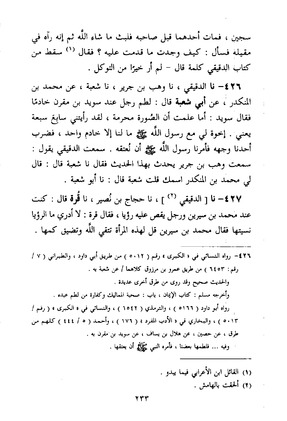426 - نا الدَّقِيقِيُّ، نا وَهْبُ بْنُ جَرِيرٍ، نا شُعْبَةُ، عَنْ مُحَمَّدِ بْنِ الْمُنْكَدِرِ، عَنْ أَبِي شُعْبَةَ قَالَ: §لَطَمَ رَجُلٌ عِنْدَ سُوَيْدِ بْنِ مُقَرِّنٍ خَادِمًا فَقَالَ سُوَيْدٌ: أَمَا عَلِمْتَ أَنَّ الصُّورَةَ مُحَرَّمَةٌ، لَقَدْ رَأَيْتُنِي سَابِعَ سَبْعَةٍ يَعْنِي إِخْوَةً لِي مَعَ رَسُولِ اللَّهِ صَلَّى اللَّهُ عَلَيْهِ وَسَلَّمَ مَا لَنَا إِلَّا خَادِمٌ وَاحِدٌ، فَضَرَبَ أَحَدُنَا وَجْهَهُ فَأَمَرَنَا رَسُولُ اللَّهِ صَلَّى اللَّهُ عَلَيْهِ وَسَلَّمَ أَنْ نُعْتِقَهُ، سَمِعْتُ الدَّقِيقِيَّ يَقُولُ: سَمِعْتُ وَهْبَ بْنَ جَرِيرٍ يُحَدِّثُ بِهَذَا الْحَدِيثِ فَقَالَ: شُعْبَةُ قَالَ: قَالَ لِي مُحَمَّدُ بْنُ الْمُنْكَدِرِ: اسْمُكَ؟ قُلْتُ: شُعْبَةُ قَالَ: نا أَبُو شُعْبَةَ