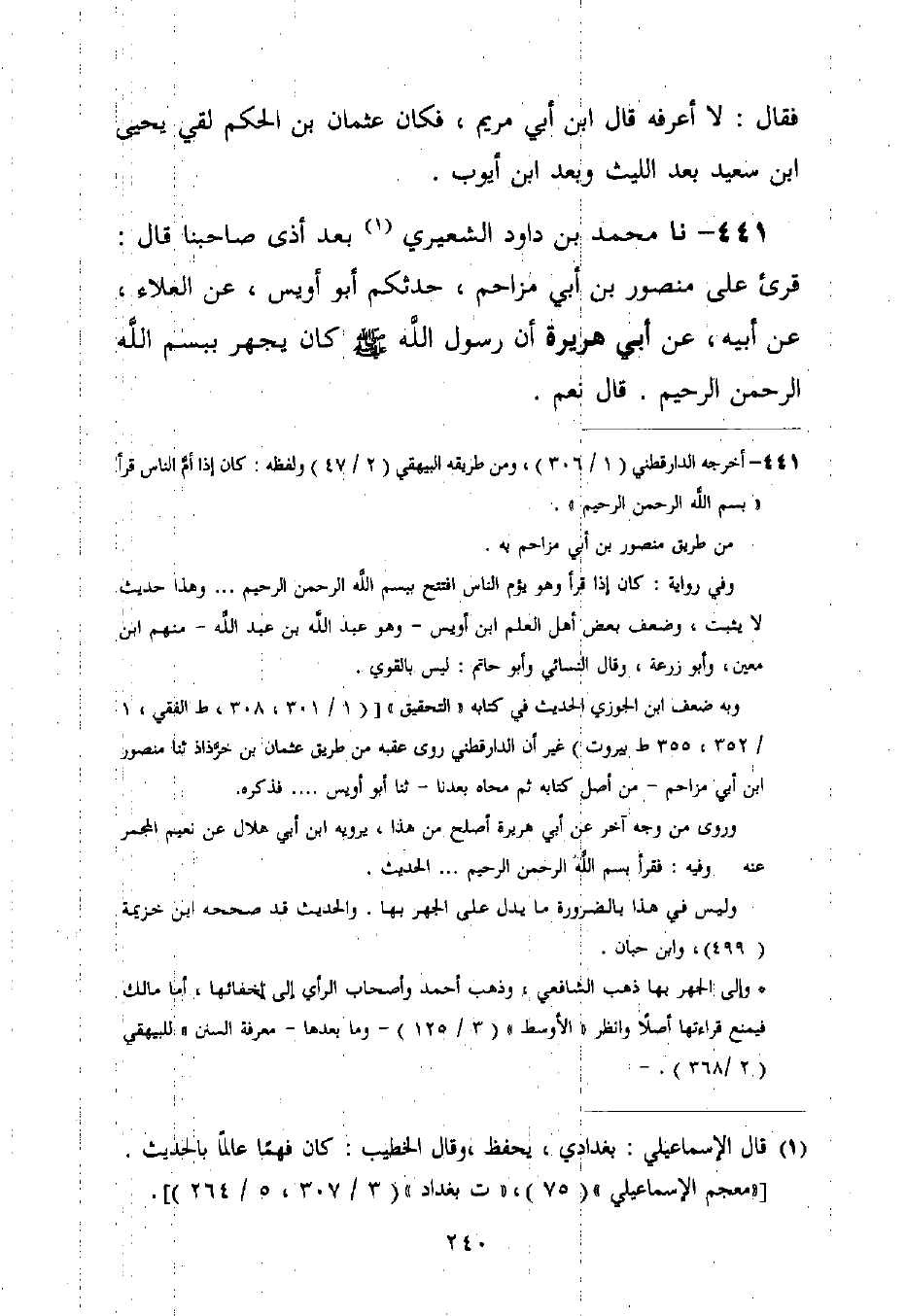 441 - نا مُحَمَّدُ بْنُ دَاوُدَ الشَّعِيرِيُّ بَعْدَ أَذَى صَاحِبِنَا قَالَ: قُرِئَ عَلَى مَنْصُورِ بْنِ أَبِي مُزَاحِمٍ، حَدَّثَكُمْ أَبُو أُوَيْسٍ، عَنِ الْعَلَاءِ، عَنْ أَبِيهِ، عَنْ أَبِي هُرَيْرَةَ أَنَّ رَسُولَ اللَّهِ صَلَّى اللَّهُ عَلَيْهِ وَسَلَّمَ §كَانَ يَجْهَرُ بِبِسْمِ اللَّهِ الرَّحْمَنِ الرَّحِيمِ؟ قَالَ: «نَعَمْ»