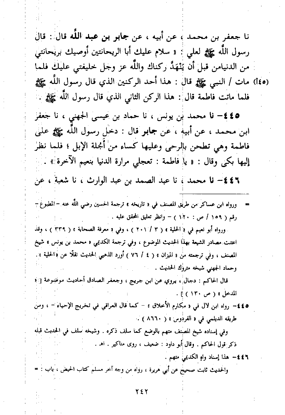 445 - نا مُحَمَّدُ بْنُ يُونُسَ، نا حَمَّادُ بْنُ عِيسَى الْجُهَنِيُّ، نا جَعْفَرُ بْنُ مُحَمَّدٍ، عَنْ أَبِيهِ، عَنْ جَابِرٍ قَالَ: دَخَلَ رَسُولُ اللَّهِ صَلَّى اللَّهُ عَلَيْهِ وَسَلَّمَ عَلَى فَاطِمَةَ وَهِيَ تَطْحَنُ بِالرَّحَى وَعَلَيْهَا كِسَاءٌ مِنْ أَجِلَّةِ الْإِبِلِ، فَلَمَّا نَظَرَ إِلَيْهَا بَكَى وَقَالَ: " يَا فَاطِمَةُ: §تَعْجَلِي مَرَارَةَ الدُّنْيَا بِنَعِيمِ الْآخِرَةِ "