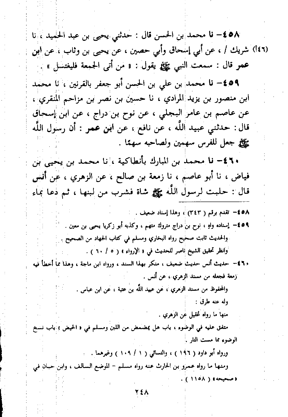 459 - نا مُحَمَّدُ بْنُ عَلِيِّ بْنِ الْحَسَنِ أَبُو جَعْفَرٍ بِالْقَرْنَيْنِ، نا مُحَمَّدُ بْنُ مَنْصُورِ بْنِ يَزِيدَ الْمُرَادِيُّ، نا حُسَيْنُ بْنُ نَصْرِ بْنِ مُزَاحِمٍ الْمِنْقَرِيُّ، عَنْ عَاصِمِ بْنِ عَامِرٍ الْبَجَلِيِّ، عَنْ نُوحِ بْنِ دَرَّاجٍ، عَنِ ابْنِ إِسْحَاقَ قَالَ: حَدَّثَنِي عُبَيْدُ اللَّهِ، عَنْ نَافِعٍ، عَنِ ابْنِ عُمَرَ: أَنَّ رَسُولَ اللَّهِ صَلَّى اللَّهُ عَلَيْهِ وَسَلَّمَ §جَعَلَ لِلْفَرَسِ سَهْمَيْنِ وَلِصَاحِبِهِ سَهْمًا