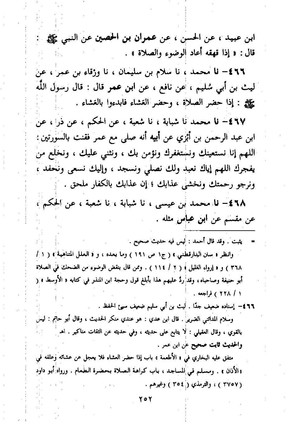 466 - نا مُحَمَّدٌ، نا سَلَّامُ بْنُ سُلَيْمَانَ، نا وَرْقَاءُ بْنُ عُمَرَ، عَنْ لَيْثِ بْنِ أَبِي سُلَيْمٍ، عَنْ نَافِعٍ، عَنِ ابْنِ عُمَرَ قَالَ: قَالَ رَسُولُ اللَّهِ صَلَّى اللَّهُ عَلَيْهِ وَسَلَّمَ: «§إِذَا حَضَرَ الصَّلَاةُ، وَحَضَرَ الْعِشَاءُ فَابْدَءُوا بِالْعَشَاءِ»