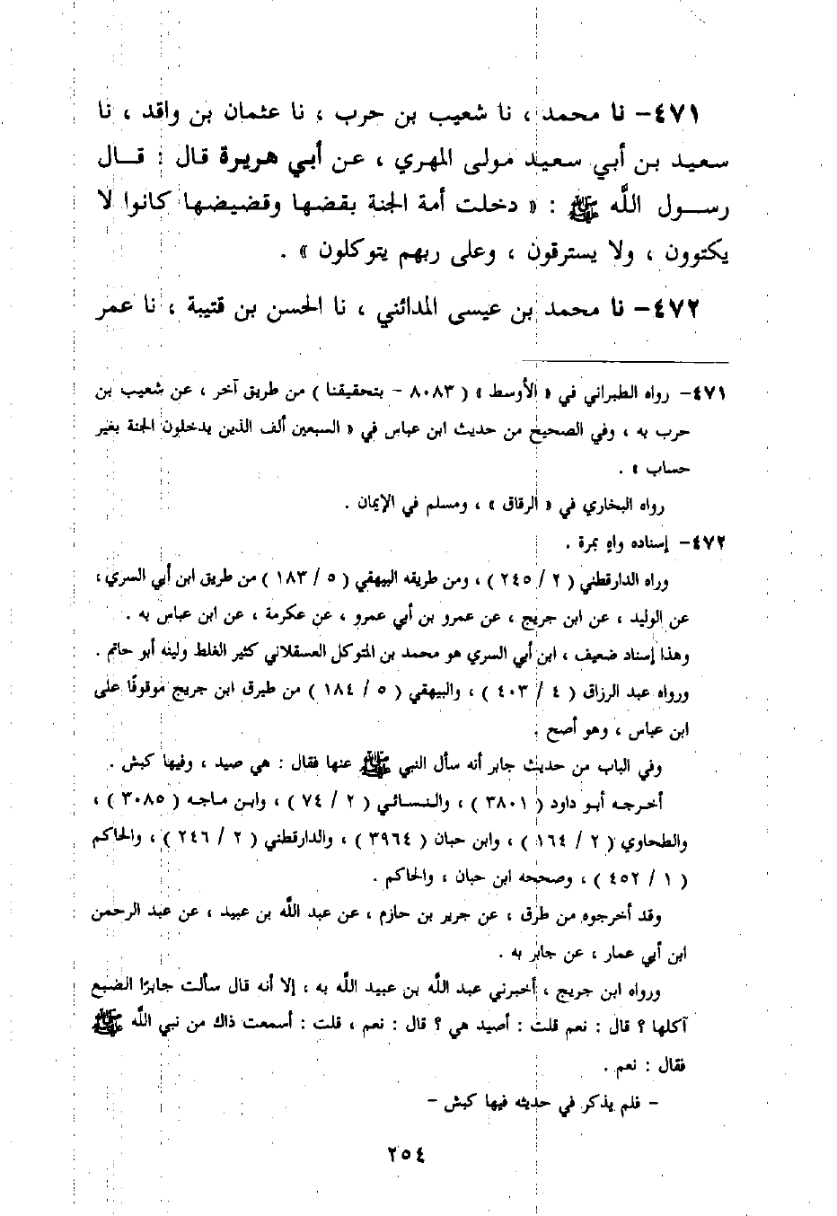 471 - نا مُحَمَّدٌ، نا شُعَيْبُ بْنُ حَرْبٍ، نا عُثْمَانُ بْنُ وَاقِدٍ، نا سَعِيدُ بْنُ أَبِي سَعِيدٍ مَوْلَى الْمَهْرِيِّ، عَنْ أَبِي هُرَيْرَةَ قَالَ: قَالَ رَسُولُ اللَّهِ صَلَّى اللَّهُ عَلَيْهِ وَسَلَّمَ: «§دَخَلَتْ أُمَّةٌ الْجَنَّةَ بِقَضِّهَا وَقَضِيضِهَا كَانُوا لَا يَكْتَوُونَ، وَلَا يَسْتَرْقُونَ، وَعَلَى ربِّهِمْ يَتَوَكَّلُونَ»