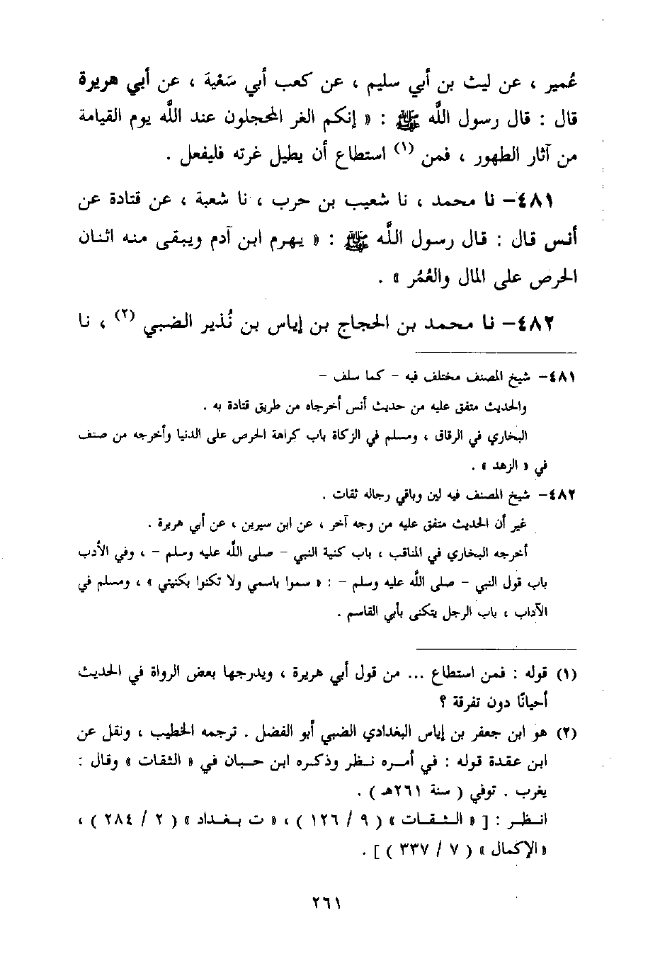 481 - نا مُحَمَّدٌ، نا شُعَيْبُ بْنُ حَرْبٍ، نا شُعْبَةُ، عَنْ قَتَادَةَ، عَنْ أَنَسٍ قَالَ: قَالَ رَسُولُ اللَّهِ صَلَّى اللَّهُ عَلَيْهِ وَسَلَّمَ: «§يَهْرَمُ ابْنُ آدَمَ وَيَبْقَى مِنْهُ اثْنَانِ الْحِرْصُ عَلَى الْمَالِ وَالْعُمْرِ»