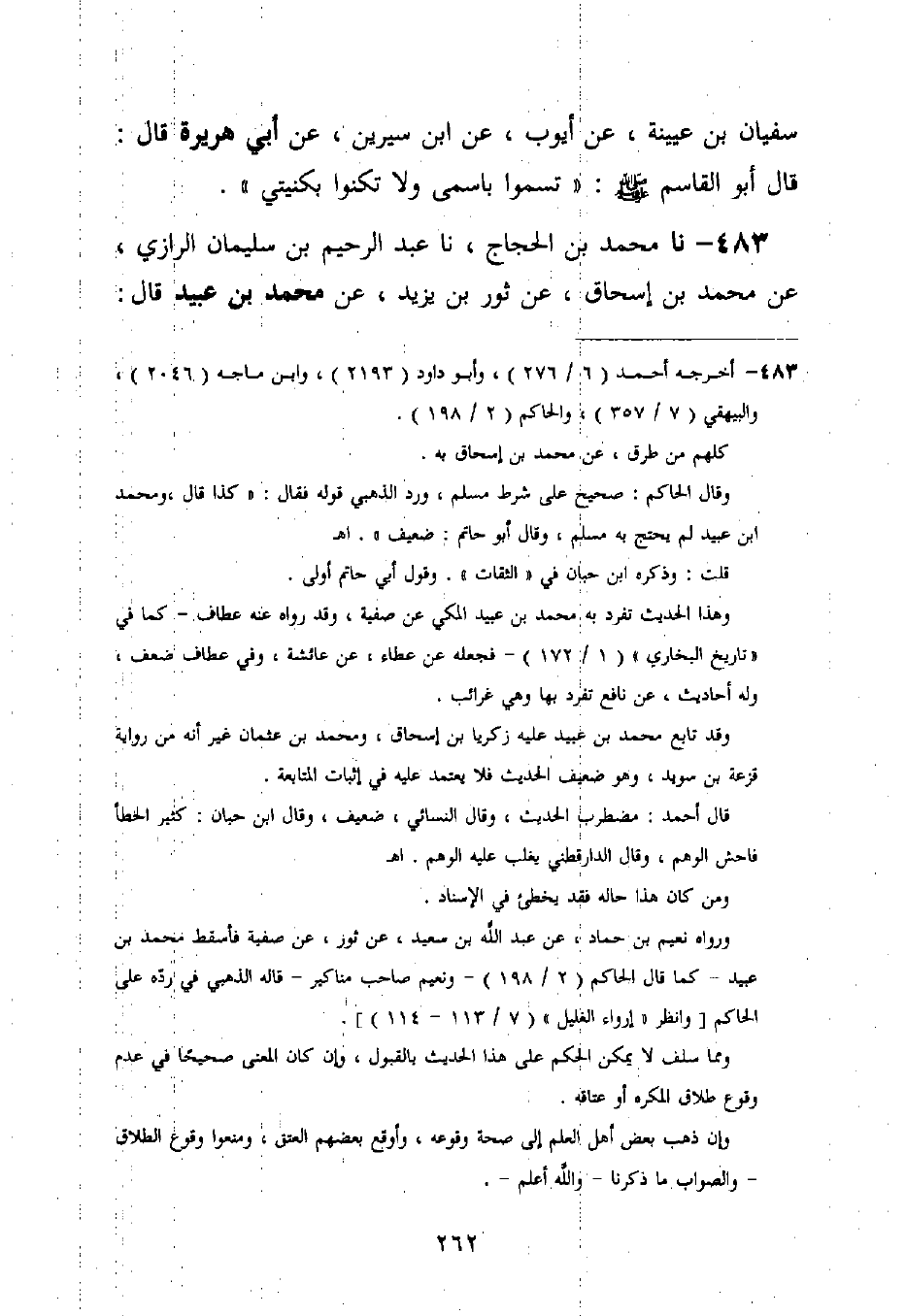 483 - نا مُحَمَّدُ بْنُ الْحَجَّاجِ، نا عَبْدُ الرَّحِيمِ بْنُ سُلَيْمَانَ الرَّازِيُّ، عَنْ مُحَمَّدِ بْنِ إِسْحَاقَ، عَنْ ثَوْرِ بْنِ يَزِيدَ، عَنْ مُحَمَّدِ بْنِ عُبَيْدٍ قَالَ: -[263]- بَعَثَنِي عَدِيُّ بْنُ عَدِيٍّ الْكِنْدِيُّ إِلَى صَفِيَّةَ بِنْتِ شَيْبَةَ أَسْأَلُهَا عَنْ أَشْيَاءَ كَانَتْ تَرْوِيهَا عَنْ عَائِشَةَ أُمِّ الْمُؤْمِنِينَ، قَالَتْ: حَدَّثَتْنِي عَائِشَةُ، أَنَّهَا سَمِعَتْ رَسُولَ اللَّهِ صَلَّى اللَّهُ عَلَيْهِ وَسَلَّمَ يَقُولُ: «§لَا عَتَاقَ وَلَا طَلَاقَ فِي إِغْلَاقٍ»