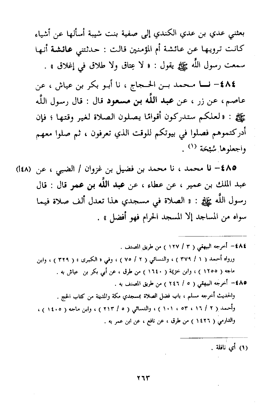 484 - نا مُحَمَّدُ بْنُ الْحَجَّاجِ، نا أَبُو بَكْرِ بْنُ عَيَّاشٍ، عَنْ عَاصِمٍ، عَنْ زِرٍّ، عَنْ عَبْدِ اللَّهِ بْنِ مَسْعُودٍ قَالَ: قَالَ رَسُولُ اللَّهِ صَلَّى اللَّهُ عَلَيْهِ وَسَلَّمَ: «§لَعَلَّكُمْ سَتُدْرِكُونَ أَقْوَامًا يُصَلُّونَ الصَّلَاةَ لِغَيْرِ وَقْتِهَا، فَإِنْ أَدْرَكْتُمُوهُمْ فَصَلُّوا فِي بُيُوتِكُمْ لِلْوَقْتِ الَّذِي تَعْرِفُونَ، ثُمَّ صَلُّوا مَعَهُمْ وَاجْعَلُوهَا سُبْحَةً»