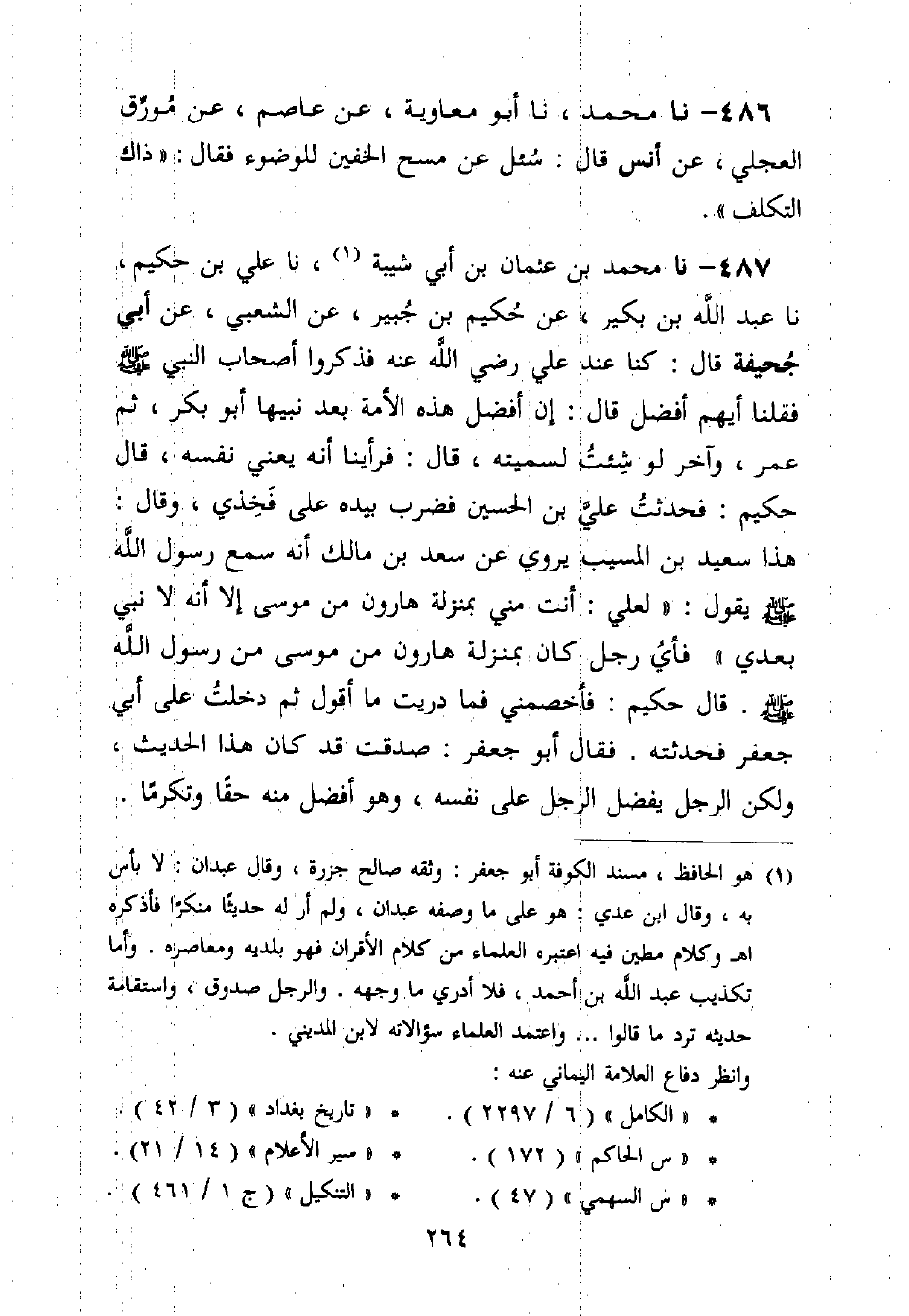 487 - نا مُحَمَّدُ بْنُ عُثْمَانَ بْنِ أَبِي شَيْبَةَ، نا عَلِيُّ بْنُ حَكِيمٍ، نا عَبْدُ اللَّهِ بْنُ بُكَيْرٍ، عَنْ حَكِيمِ بْنِ جُبَيْرٍ، عَنِ الشَّعْبِيِّ، عَنْ أَبِي جُحَيْفَةَ قَالَ: كُنَّا عِنْدَ عَلِيٍّ رَضِيَ اللَّهُ عَنْهُ فَذَكَرُوا أَصْحَابَ النَّبِيِّ صَلَّى اللَّهُ عَلَيْهِ وَسَلَّمَ فَقُلْنَا أَيُّهُمْ أَفْضَلُ؟ قَالَ: إِنَّ §أَفْضَلَ هَذِهِ الْأُمَّةِ بَعْدَ نَبِيِّهَا أَبُو بَكْرٍ، ثُمَّ عُمَرُ، وَآخَرُ لَوْ شِئْتُ لَسَمَّيْتُهُ قَالَ: فَرَأَيْنَا أَنَّهُ يَعْنِي نَفْسَهُ
