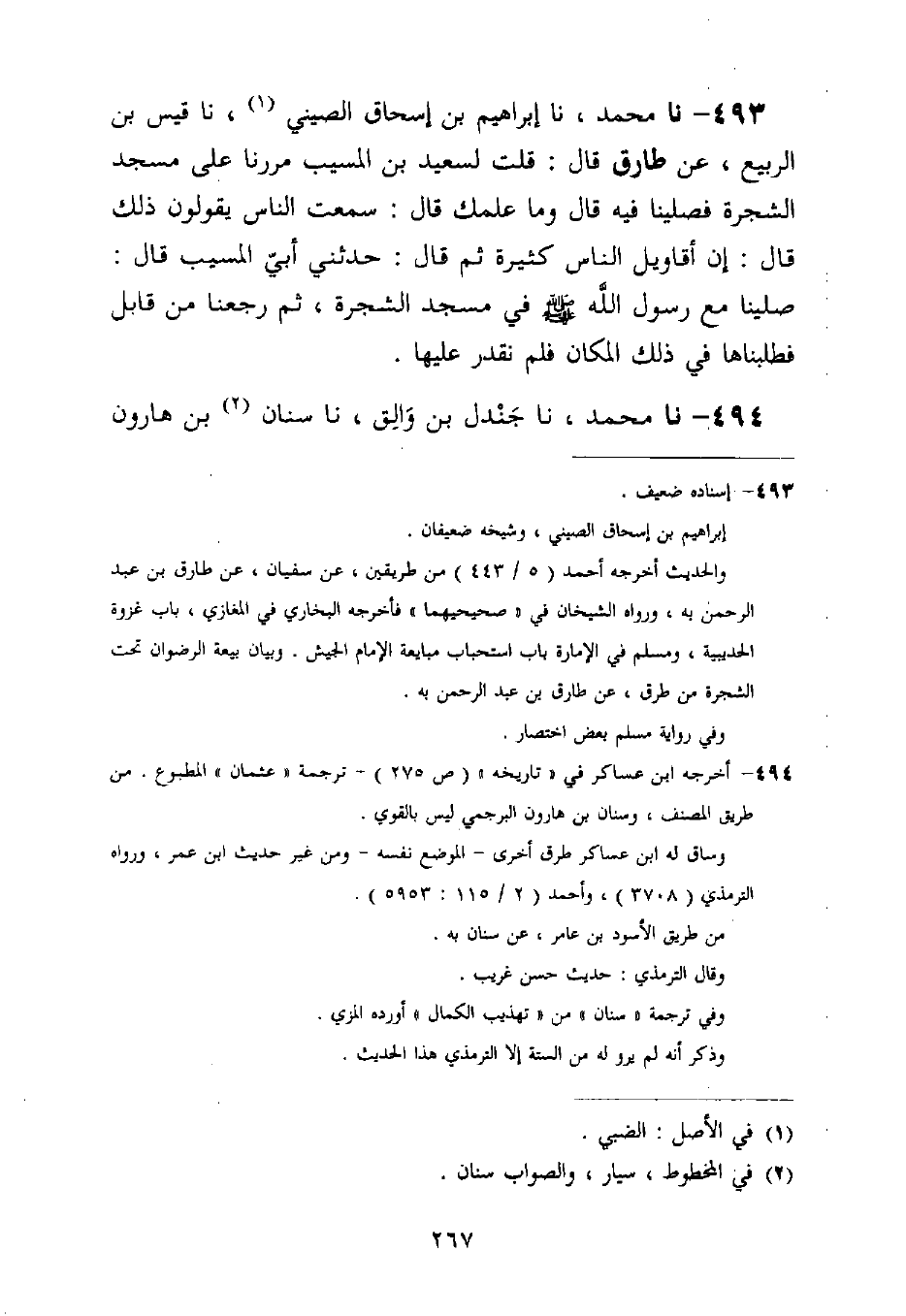 493 - نا مُحَمَّدٌ، نا إِبْرَاهِيمُ بْنُ إِسْحَاقَ الصِّينِيُّ، نا قَيْسُ بْنُ الرَّبِيعِ، عَنْ طَارِقٍ قَالَ: قُلْتُ لِسَعِيدِ بْنِ الْمُسَيِّبِ مَرَرْنَا عَلَى مَسْجِدِ الشَّجَرَةِ فَصَلَّيْنَا فِيهِ قَالَ وَمَا عِلْمُكَ قَالَ: سَمِعْتُ النَّاسَ يَقُولُونَ ذَلِكَ قَالَ: إِنَّ أَقَاوِيلَ النَّاسِ كَثِيرَةٌ ثُمَّ قَالَ: حَدَّثَنِي أَبِي الْمُسَيِّبُ قَالَ: §صَلَّيْنَا مَعَ رَسُولِ اللَّهِ صَلَّى اللَّهُ عَلَيْهِ وَسَلَّمَ فِي مَسْجِدِ الشَّجَرَةِ، ثُمَّ رَجَعْنَا مِنْ قَابِلٍ فَطَلَبْنَاهَا فِي ذَلِكَ الْمَكَانِ فَلَمْ نَقْدِرْ عَلَيْهَا