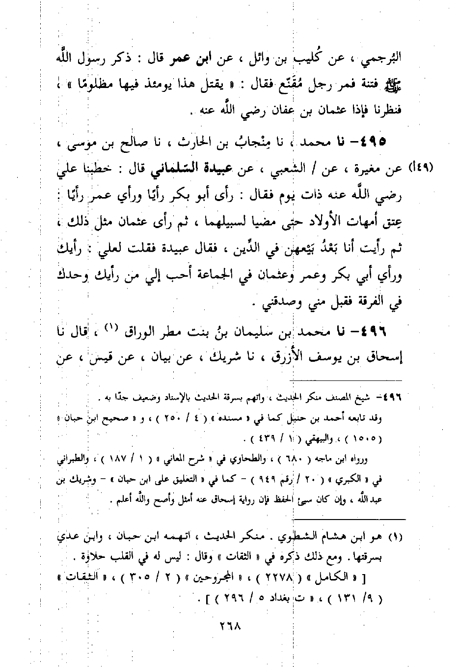 495 - نا مُحَمَّدٌ، نا مِنْجَابُ بْنُ الْحَارِثِ، نا صَالِحُ بْنُ مُوسَى، عَنْ مُغِيرَةَ، عَنِ الشَّعْبِيِّ، عَنْ عَبِيدَةَ السَّلْمَانِيِّ قَالَ: خَطَبَنَا عَلِيٌّ رَضِيَ اللَّهُ عَنْهُ ذَاتَ يَوْمٍ فَقَالَ: رَأَى أَبُو بَكْرٍ رَأْيًا وَرَأَى عُمَرُ رَأْيًا: §عِتْقُ أُمَّهَاتِ الْأَوْلَادِ حَتَّى مَضَيَا لِسَبِيلِهِمَا، ثُمَّ رَأَى عُثْمَانُ مِثْلَ ذَلِكَ، ثُمَّ رَأَيْتُ أَنَا بَعْدُ بَيْعَهُنَّ فِي الدَّيْنِ، فَقَالَ عُبَيْدَةُ فَقُلْتُ لِعَلِيٍّ: رَأْيُكَ وَرَأْيُ أَبِي بَكْرٍ وَعُمَرَ وَعُثْمَانَ فِي الْجَمَاعَةِ أَحَبُّ إِلَيَّ مِنْ رَأْيِكَ وَحْدَكَ فِي الْفُرْقَةِ فَقَبِلَ مِنِّي وَصَدَّقَنِي