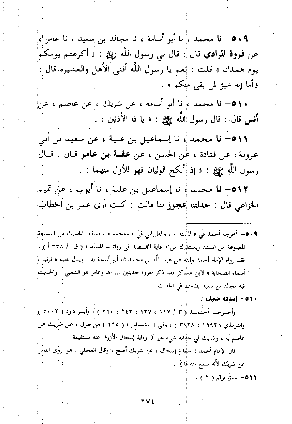 509 - نا مُحَمَّدٌ، نا أَبُو أُسَامَةَ، نا مُجَالِدُ بْنُ سَعِيدٍ، نا عَامِرٌ، عَنْ فَرْوَةَ الْمُرَادِيِّ قَالَ: قَالَ لِي رَسُولُ اللَّهِ صَلَّى اللَّهُ عَلَيْهِ وَسَلَّمَ: «§أَكَرِهْتُمْ يَوْمَكُمْ يَوْمَ هَمْدَانَ» قُلْتُ: نَعَمْ يَا رَسُولَ اللَّهِ، أَفْنَى الْأَهْلَ وَالْعَشِيرَةَ قَالَ: «أَمَا إِنَّهُ خَيْرٌ لِمَنْ بَقِيَ مِنْكُمْ»