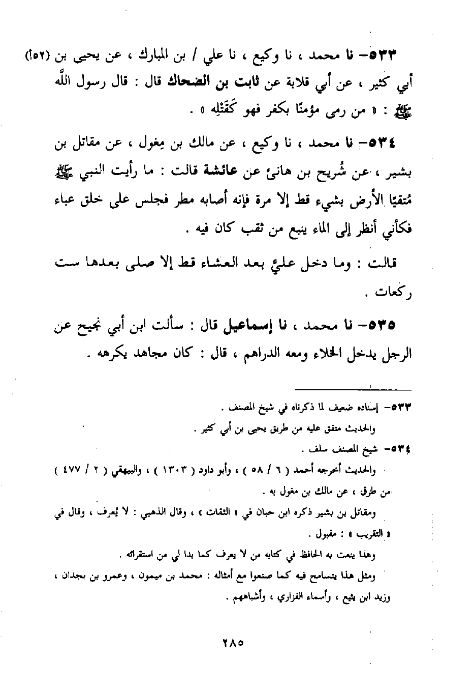 533 - نا مُحَمَّدٌ، نا وَكِيعٌ، نا عَلِيُّ بْنُ الْمُبَارَكِ، عَنْ يَحْيَى بْنِ أَبِي كَثِيرٍ، عَنْ أَبِي قِلَابَةَ، عَنْ ثَابِتِ بْنِ الضَّحَّاكِ قَالَ: قَالَ رَسُولُ اللَّهِ صَلَّى اللَّهُ عَلَيْهِ وَسَلَّمَ: «§مَنْ رَمَى مُؤْمِنًا بِكُفْرٍ فَهُوَ كَقَتْلِهِ»