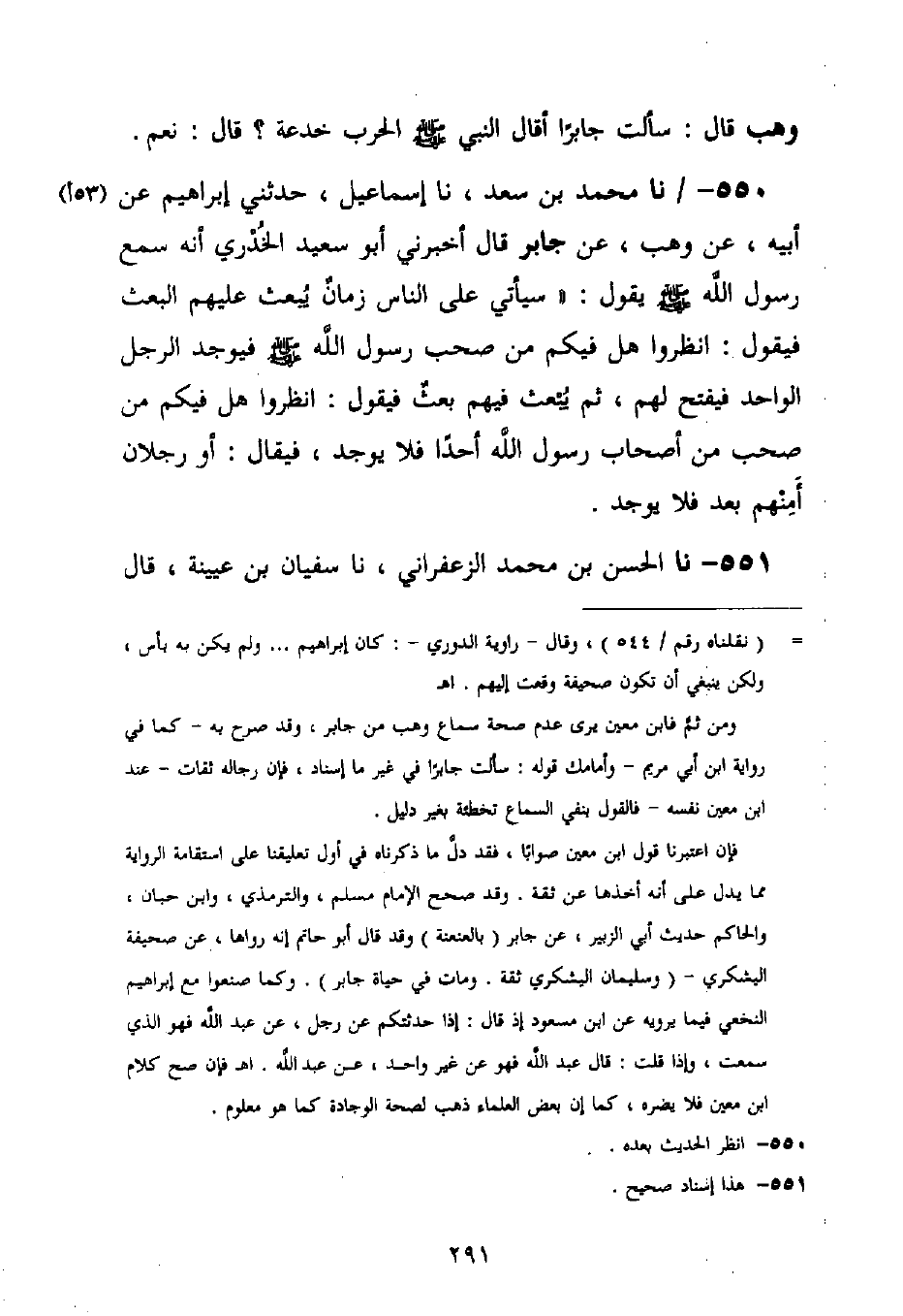 550 - نا مُحَمَّدُ بْنُ سَعْدٍ، نا إِسْمَاعِيلُ، حَدَّثَنِي إِبْرَاهِيمُ، عَنْ أَبِيهِ، عَنْ وَهْبٍ، عَنْ جَابِرٍ قَالَ: أَخْبَرَنِي أَبُو سَعِيدٍ الْخُدْرِيُّ، أَنَّهُ سَمِعَ رَسُولَ اللَّهِ صَلَّى اللَّهُ عَلَيْهِ وَسَلَّمَ يَقُولُ: " §سَيَأْتِي عَلَى النَّاسِ زَمَانٌ يُبْعَثُ عَلَيْهِمُ الْبَعْثُ فَيَقُولُ: انْظُرُوا هَلْ فِيكُمْ مَنْ صَحِبَ رَسُولَ اللَّهِ صَلَّى اللَّهُ عَلَيْهِ وَسَلَّمَ فَيُوجَدُ الرَّجُلُ الْوَاحِدُ فَيُفْتَحُ لَهُمْ، ثُمَّ يُبْعَثُ فِيهِمْ بَعْثٌ فَيَقُولُ: انْظُرُوا هَلْ فِيكُمْ مَنْ صَحِبَ مِنْ أَصْحَابِ رَسُولِ اللَّهِ أَحَدًا فَلَا يُوجَدُ، فَيُقَالُ: أَوْ رَجُلَانِ أَمِنْهُمْ بَعْدُ فَلَا يُوجَدُ