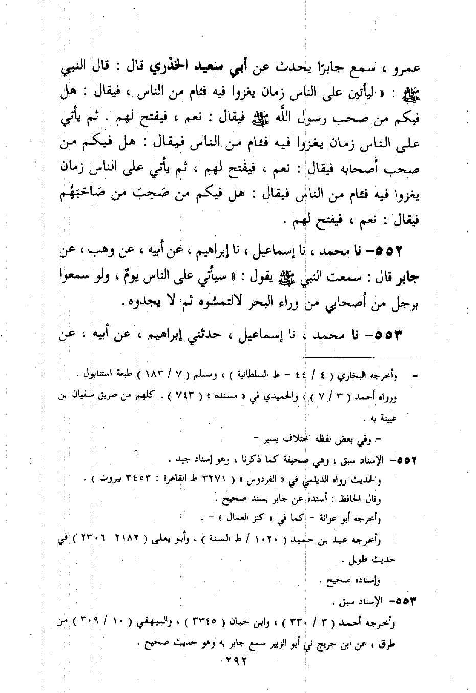 552 - نا مُحَمَّدٌ، نا إِسْمَاعِيلُ، نا إِبْرَاهِيمُ، عَنْ أَبِيهِ، عَنْ وَهْبٍ، عَنْ جَابِرٍ قَالَ: سَمِعْتُ النَّبِيَّ صَلَّى اللَّهُ عَلَيْهِ وَسَلَّمَ يَقُولُ: «§سَيَأْتِي عَلَى النَّاسِ يَوْمٌ، وَلَوْ سَمِعُوا بِرَجُلٍ مِنْ أَصْحَابِي مِنْ وَرَاءِ الْبَحْرِ لَالْتَمَسُوهُ ثُمَّ لَا يَجِدُوهُ»