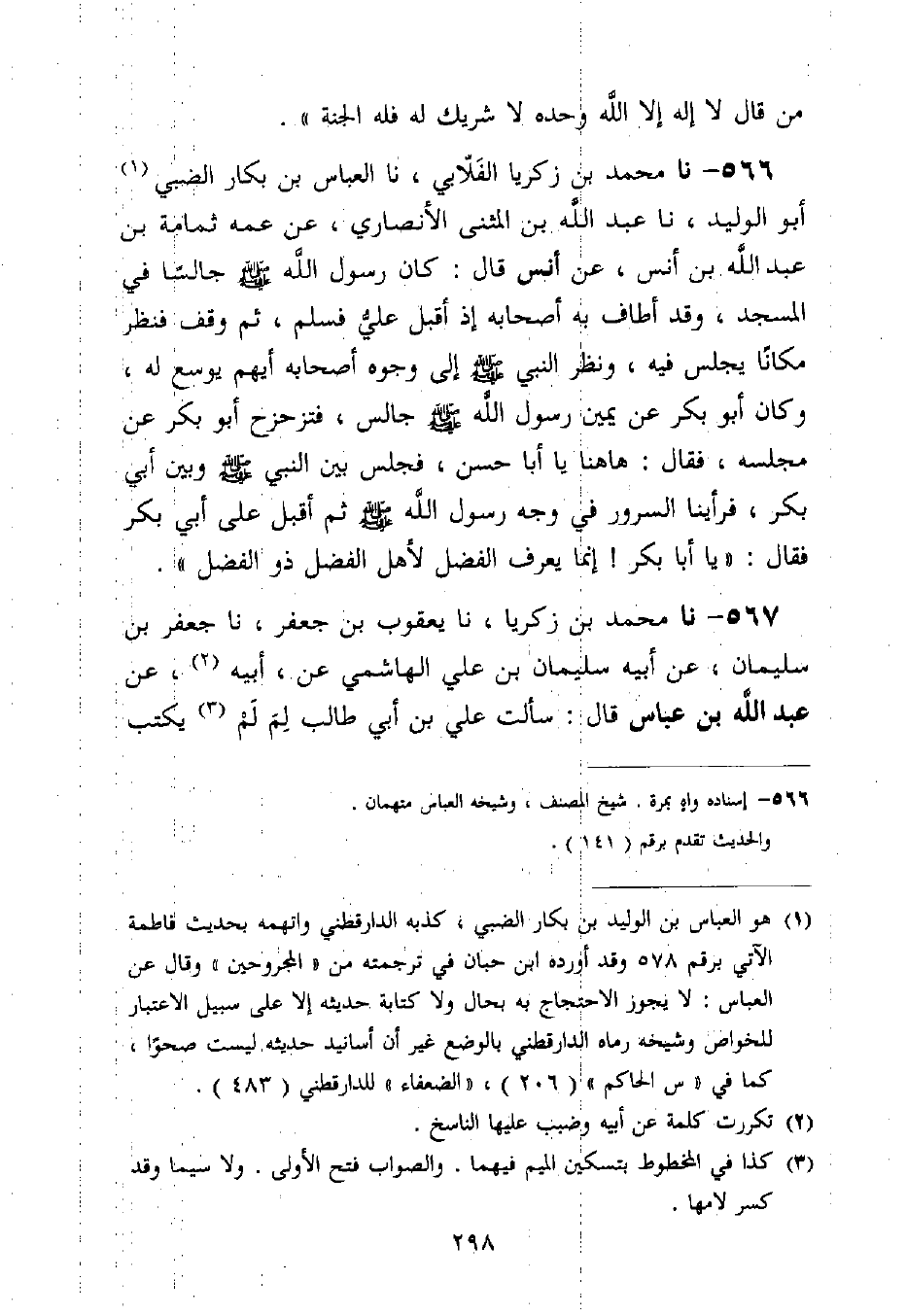 566 - نا مُحَمَّدُ بْنُ زَكَرِيَّا الْغَلَابِيُّ، نا الْعَبَّاسُ بْنُ بَكَّارٍ الضَّبِّيُّ أَبُو الْوَلِيدِ، نا عَبْدُ اللَّهِ بْنُ الْمُثَنَّى الْأَنْصَارِيُّ، عَنْ عَمِّهِ ثُمَامَةَ بْنِ عَبْدِ اللَّهِ بْنِ أَنَسٍ، عَنْ أَنَسٍ قَالَ: كَانَ رَسُولُ اللَّهِ صَلَّى اللَّهُ عَلَيْهِ وَسَلَّمَ جَالِسًا فِي الْمَسْجِدِ، وَقَدْ أَطَافَ بِهِ أَصْحَابُهُ إِذْ أَقْبَلَ عَلِيٌّ فَسَلَّمَ، ثُمَّ وَقَفَ فَنَظَرَ مَكَانًا يَجْلِسُ فِيهِ، وَنَظَرَ النَّبِيُّ صَلَّى اللَّهُ عَلَيْهِ وَسَلَّمَ إِلَى وُجُوهِ أَصْحَابِهِ أَيُّهُمْ يُوَسِّعُ لَهُ، وَكَانَ أَبُو بَكْرٍ عَنْ يَمِينِ رَسُولِ اللَّهِ صَلَّى اللَّهُ عَلَيْهِ وَسَلَّمَ جَالِسٌ، فَتَزَحْزَحَ أَبُو بَكْرٍ عَنْ مَجْلِسِهِ، فَقَالَ: هَاهُنَا يَا أَبَا حَسَنٍ، فَجَلَسَ بَيْنَ النَّبِيِّ صَلَّى اللَّهُ عَلَيْهِ وَسَلَّمَ وَبَيْنَ أَبِي بَكْرٍ، فَرَأَيْنَا السُّرُورَ فِي وَجْهِ رَسُولِ اللَّهِ صَلَّى اللَّهُ عَلَيْهِ وَسَلَّمَ، ثُمَّ أَقْبَلَ عَلَى أَبِي بَكْرٍ فَقَالَ: «يَا أَبَا بَكْرِ، إِنَّمَا §يَعْرِفُ الْفَضْلَ لِأَهْلِ الْفَضْلِ ذُو الْفَضْلِ»